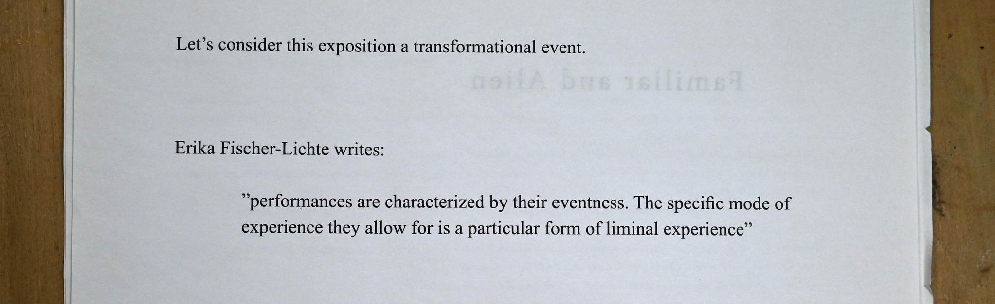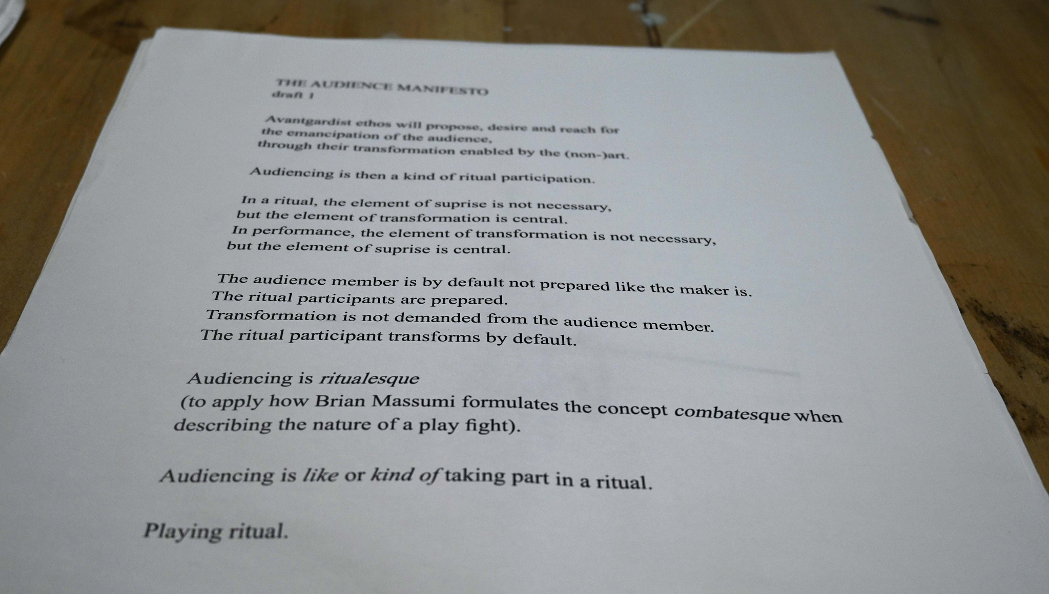 The relationship between theatre and ritual was something that had been present in my work and in the genre of esitystaide/beforemance art at large (see Draft 5). In this context rituals are mostly understood as transformational events, in which the participants enter a liminal space and return to the everyday changed in some way.