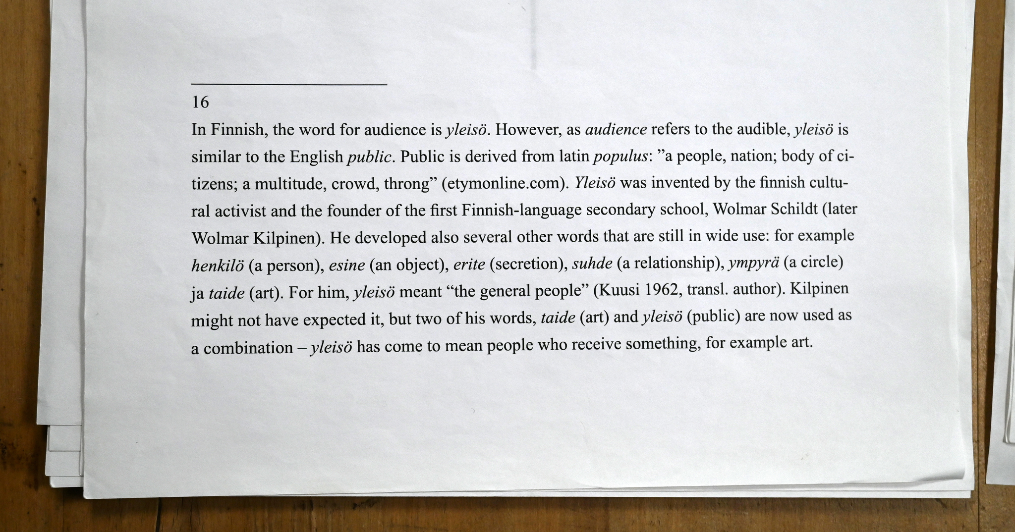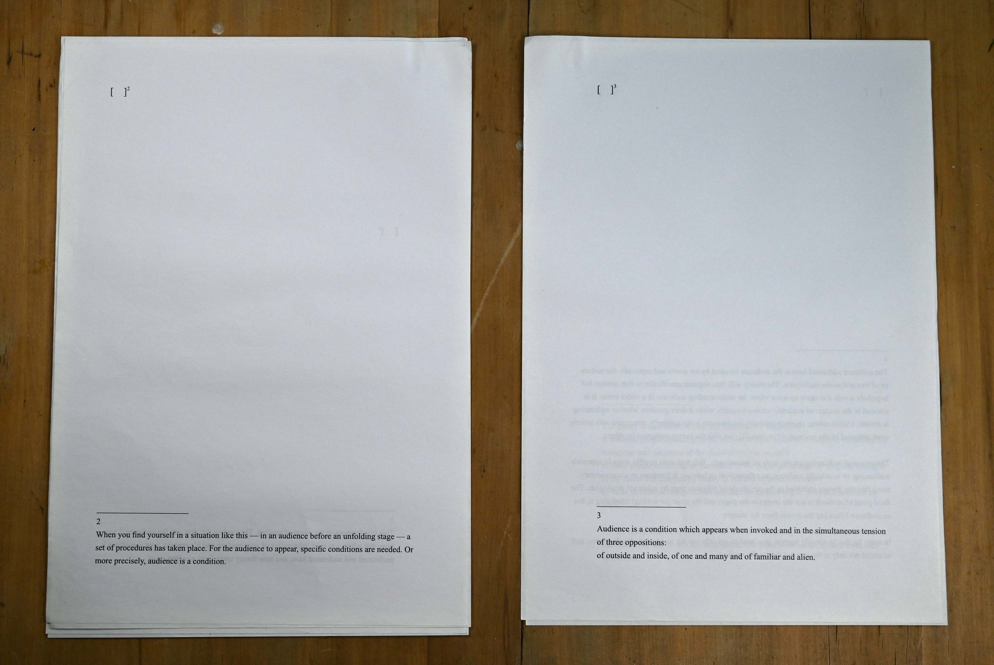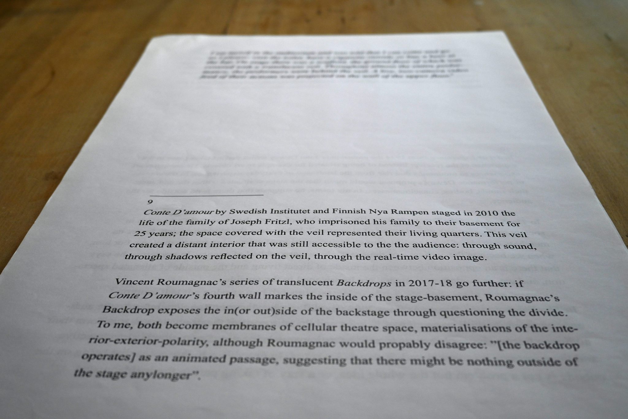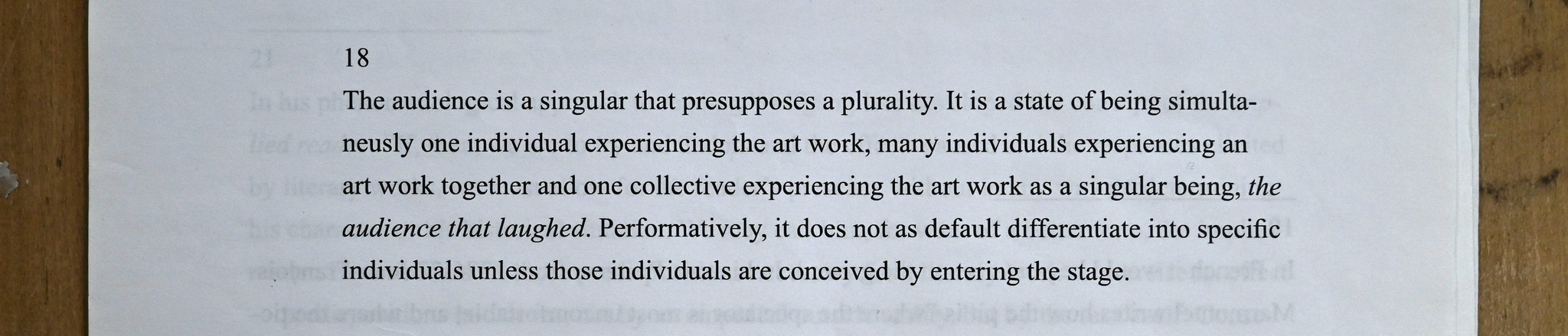 This was clearly linked to my evolving research practice, in which I deliberately realized performances in which no human performer body would enter the stage, but which were nevertheless haunted by my absent body, making the absence of a performer body debatable. Through the introduction of footnotes with no text body this gesture was repeated on the level of the page. Even when only footnotes remain, the body of the reader is needed for the content of the text to resonate somewhere. The performer body could be removed from an esitys/beforemance without compromising its existence, but the audience body would still be required.