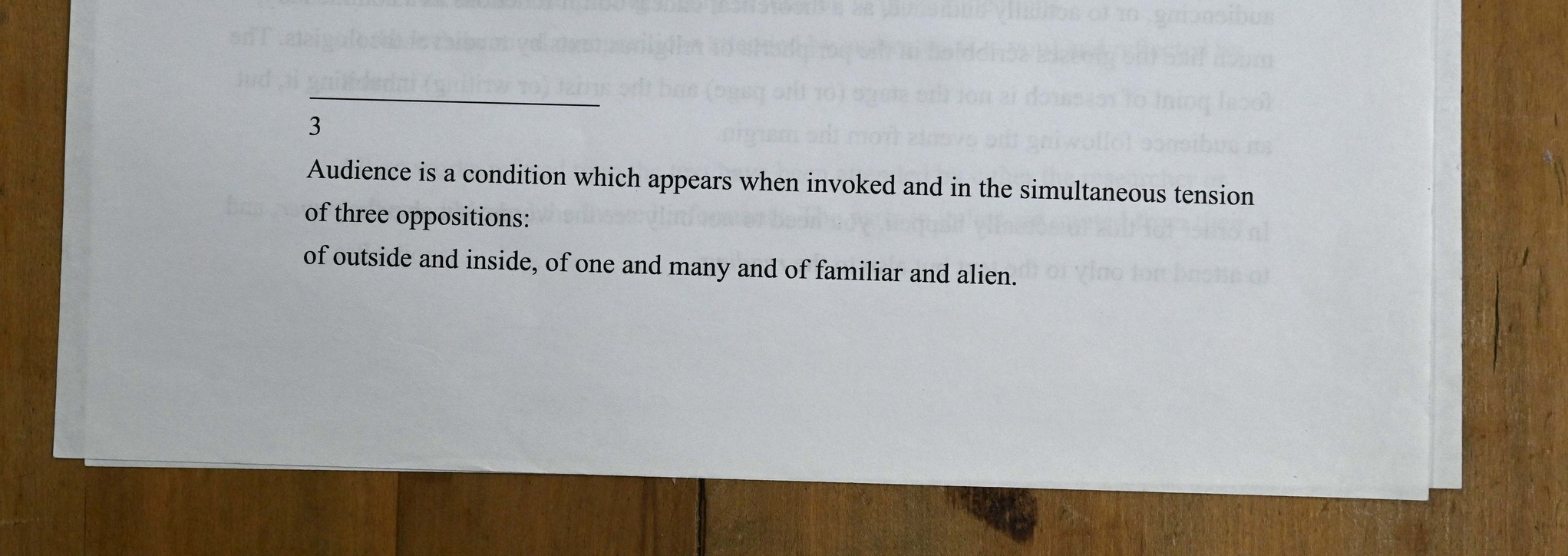 The thesis of A Theory of Audience was a three-dimensional coordinate system, each axis of which corresponded to a dimension, and a polar tension, necessary for an audience to emerge. In this model, audience is a condition which one can enter and exit. When being affected by this condition, you are in a nexus of the three lines of tension, between three pairs of opposites. You are moving in between being inside and outside, in between being one or being many and in between what is familiar and alien to you.