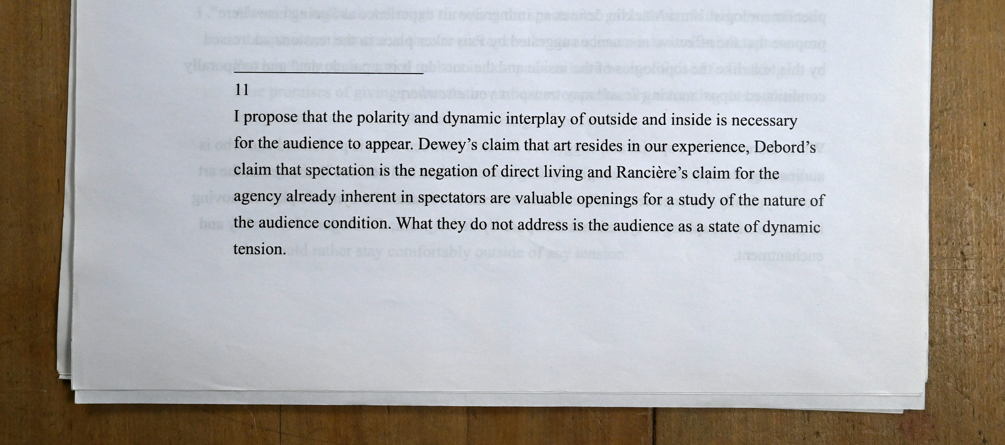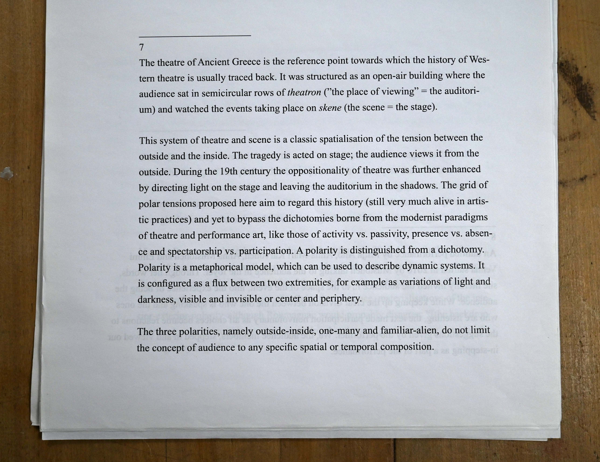 The first chapter dealt with audience being constantly in the tension between outside and inside: when entering a theatre, “we are within the event, immersed in the space of theatre, and simultaneously outside of the stage”. I proposed that as an audience, we do not want to actually be inside, but we want an experience of being inside. This charge is related to the condition of liminoid dramaturgy, a concept which I adopted at a later stage of my research.