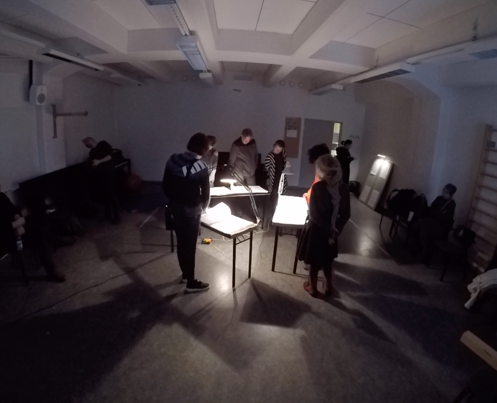 Installing three chapters of the work on three tables that formed a triangle in the center of the room and placing some chairs on the sides of the room proposed and initiated a specific way for the audience body to situate itself and move in the space. The tables suggested standing in front of them reading, forming a triangle of audience body parts. The chairs suggested that one could also sit there and view the other parts of the audience body engaged in reading. Also the lighting design, three table lamps shedding light on the scripts, supported the idea of a stage in the middle of the room. It was relatively effortless to move between these two positions. Also, one could step out of the room, although I had not explicitly suggested that. Due to the installation-type format and the light in the centre of the room, it was quite easy to do that without drawing attention. One of the attendees also did step out and returned.