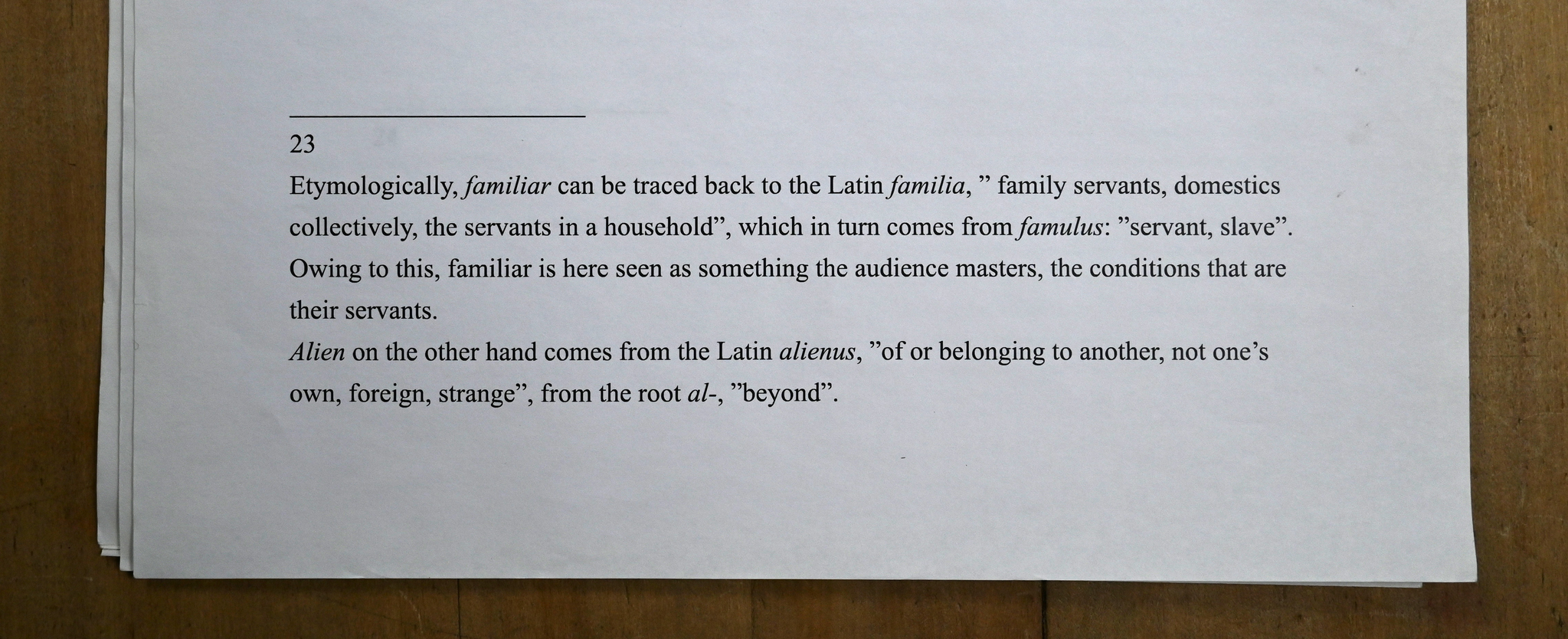 The different chapters of Draft 13 used different iterations of the footnote aesthetic. In the prologue, there was no body of text (i.e. a pause, see Draft 7). In Outside and Inside on each page was one quote from an audience member I had interviewed, while my own research writing was located in the footnote. In One and Many the same continued, but I had composed dialogues from audience comments. In Familiar and Alien the footnote structure eventually disintegrated.