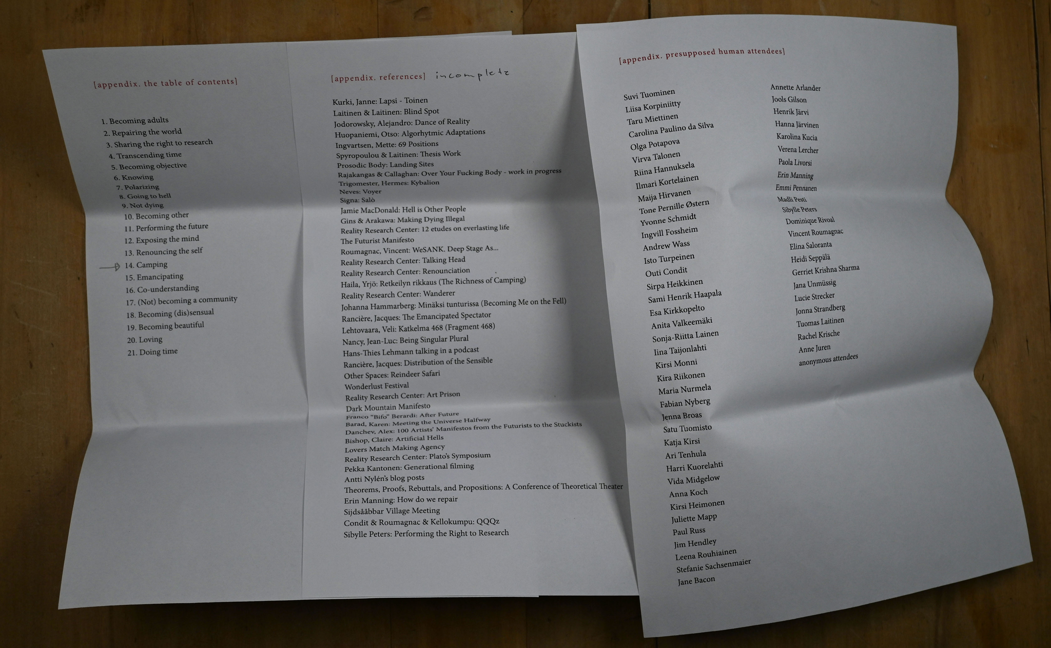 This gesture was expanding the norm in different ways. The list of chapters was common from the context of literature, but the structure I used here, in which each audience member could only read one chapter and was made aware of the other 20, emphasized an aspect of the phenomenon of audience in which each member has a different and singular experience and together these perspectives compose a collective event. The listing of sources was something I had done before; it was also familiar from the academic context. In the context of live performance it was very uncommon—this I have addressed already elsewhere. The list of attendees was the most unconventional gesture of the three and disturbed the expectation of an anonymous audience, whose impact on the work is typically left implicit and uncredited.