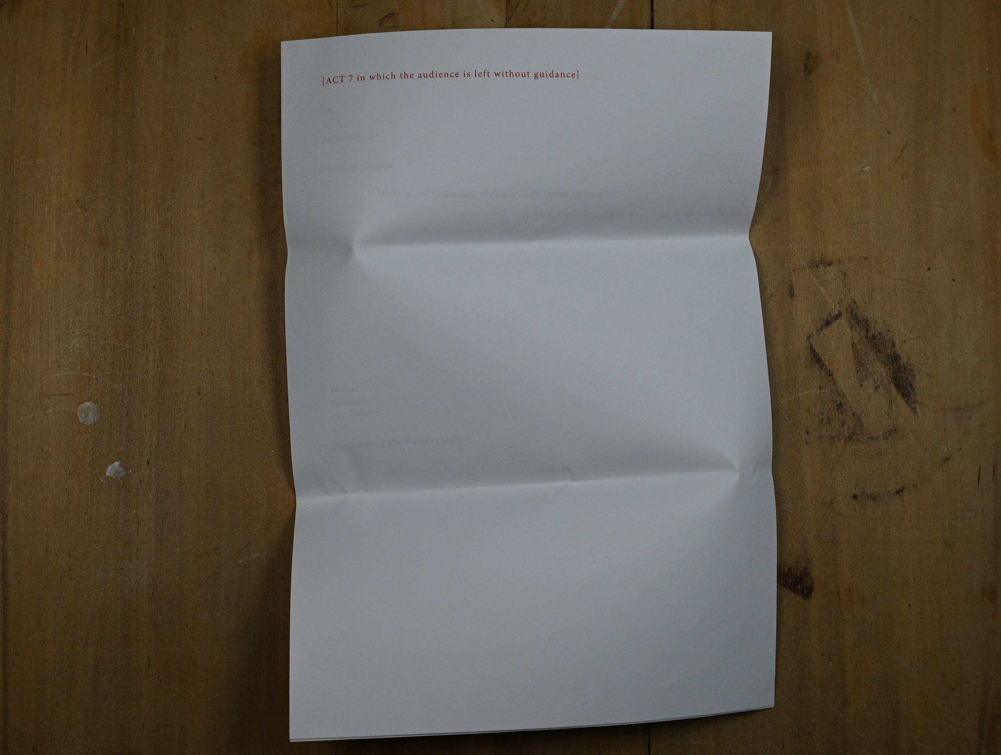 When a subordinate relation between the makers and the audience has been established, some of the agency can be and inevitably is distributed also to the audience. This was evident implicitly already several times in the Draft series, when the motif of subordination was experimented on: for example when the audience members of Draft 2, 4 and 5 were left with 30 or 45 minutes of unstructured time or when they took turns in reading aloud in Draft 11. Explicit it started to become when I offered them practices in the etudes of Draft 14.