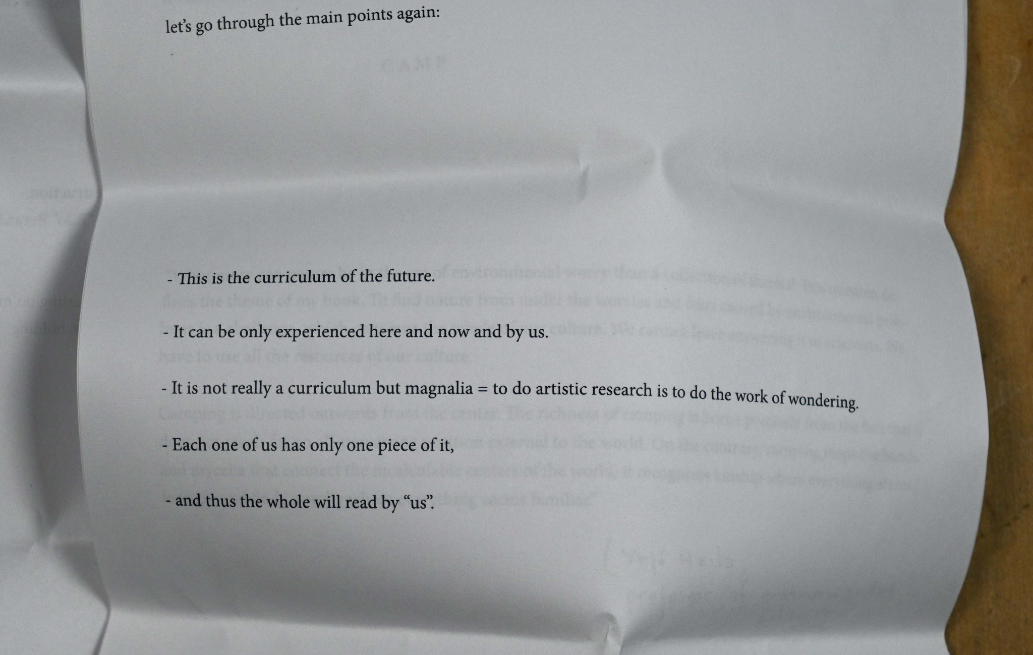 This is a curriculum. It is presented and received in a specific way: specific in time, place, materials and attendees. No-one else, nowhere else and at no other point in time could present or receive this curriculum. So, our time is precious.