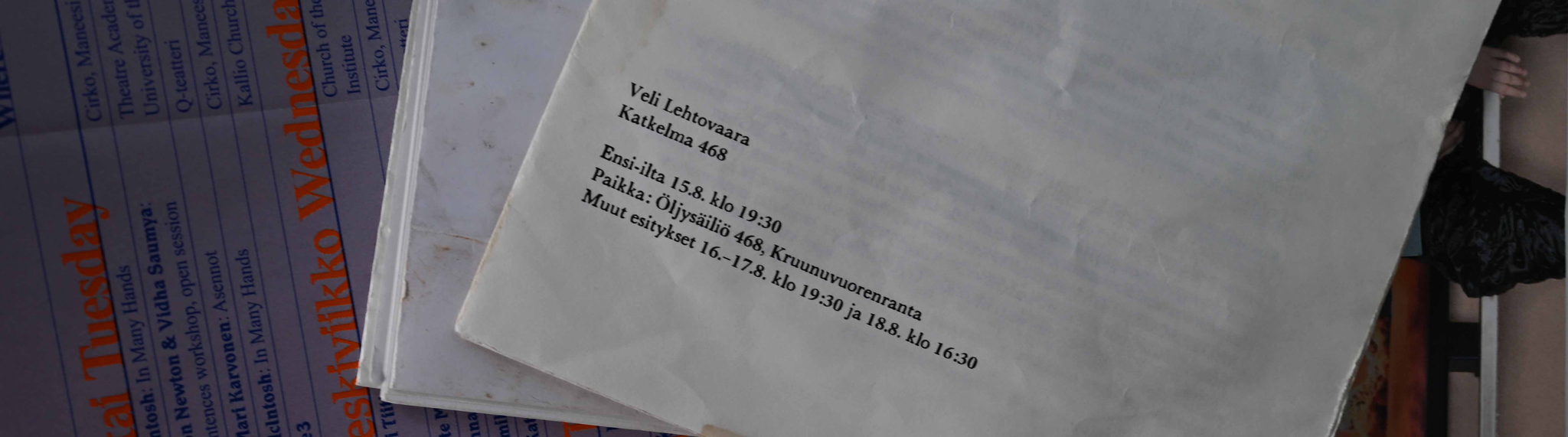 Convened by the lighting designer Tomi Humalisto, the working group created a performance taking place in the dark. The audience is thus deprived of their spectatorship and yet something is performed before them. There is a set and there are performers, but since taking away the sense of sight also compromises the benefits of distance, the audience members are allowed to move in the space with the help of their hearing and touch. The work is thus encountered as sounds, materials on skin, kinesthetic sensations and such. Clearly it was experimenting with the borderlines of esitys through kind of an inversion of the theatrical disposition.