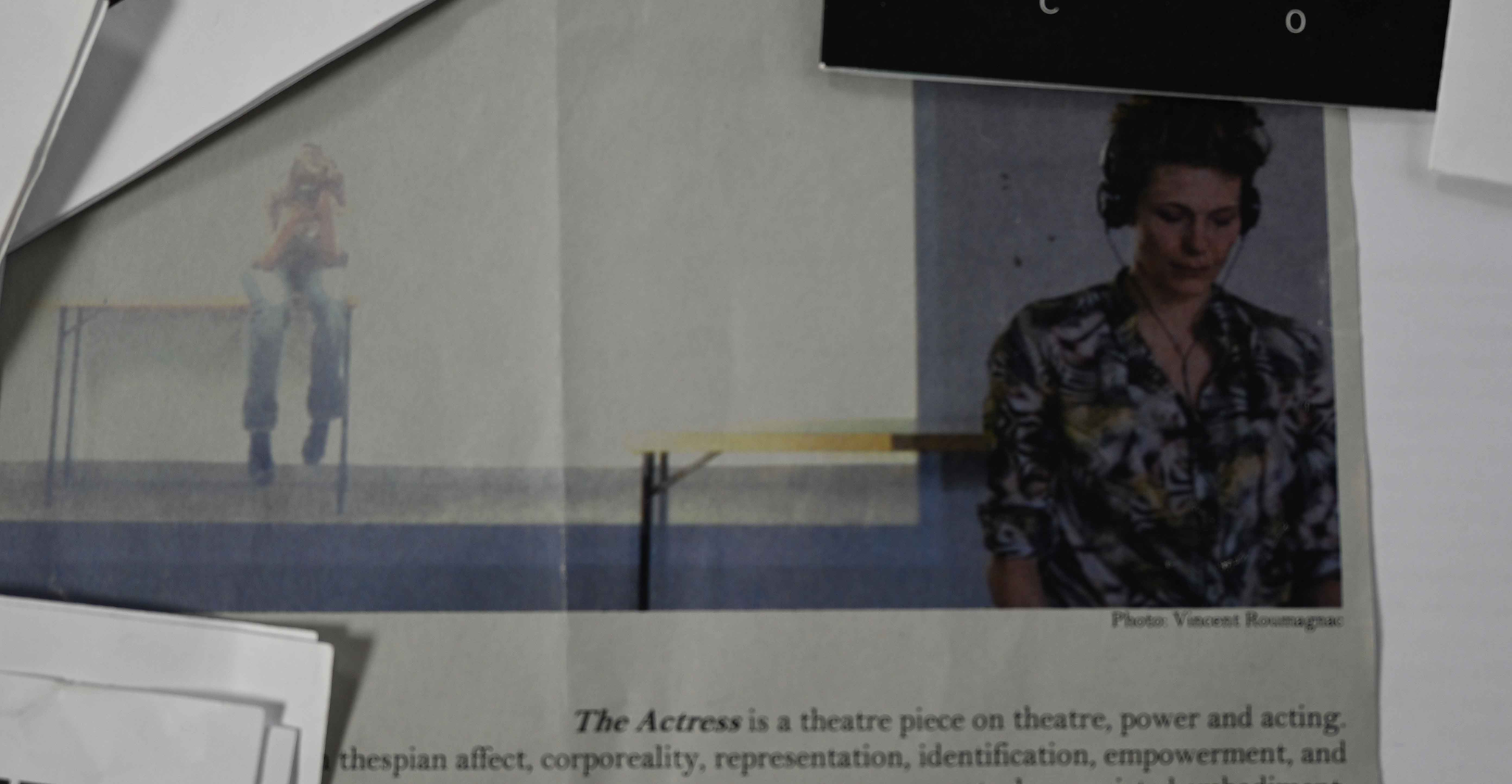 Pairing with Channeling, the work takes place along the same corridor the day before. I audience it twice during the run of performances and a third time the following spring. I wanted to re-experience it since it gave me an inspiring example of a way to intertwine discursive thinking and live performance, reflecting itself in real time. This way of de-seperating the research from the art was also what I wanted and would do in the future. Condit had in this way a very important influence on my research practice. The performance also had one gesture which was almost identical to one made in a performance I had directed years before (Solta by Kuriton Company, made in collaboration with actor Heidi Syrjäkari, dramaturge E.L.Karhu and sound designer Tuomas Rounakari): a fake mustache placed on a wall as a sort of a dominating male figure (a director maybe or even a divine being).