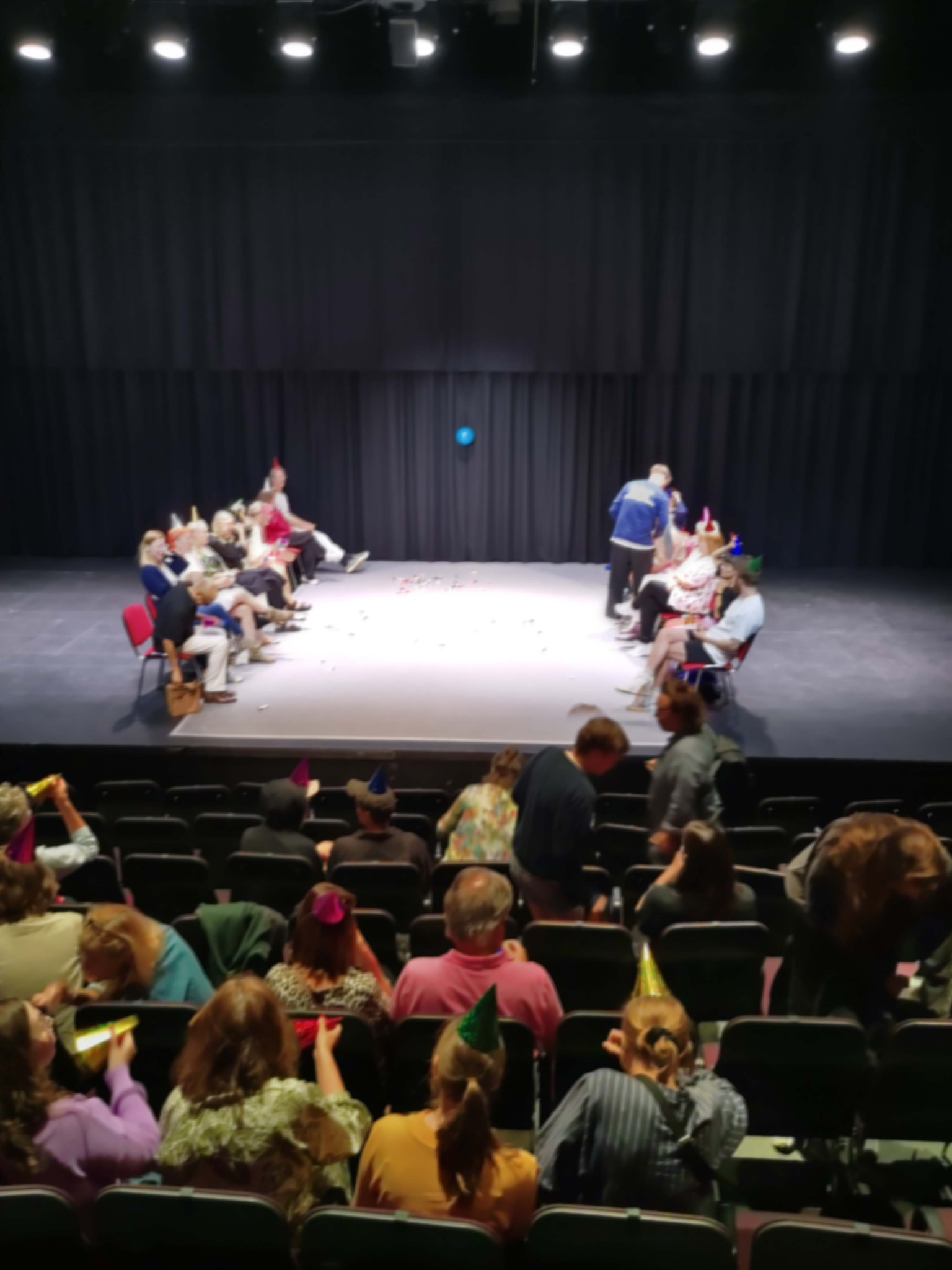 Sometimes resonance surfaces performatively in a performance; in specific moments it can be almost palpable. For example, in Nano Steps by the group Trial & Theatre the performers manipulate miniscule particles with sound, while projecting an enlarged microscopic view of the particles on a screen at the back of the stage. We, meaning the 300 audience members of the show, sit silently in the auditorium while performer En Ping Yu is making small sounds with different materials and uses a microphone to amplify them for the purposes of this particle puppetry. In one moment of silence, an audience member coughs. The particles jump on the screen. The audience notices how this involuntary sound that has emerged from us has affected the sensitive technological arrangement onstage. We laugh. Particles jump again in response. The silent resonance that has lurked there all along unnoticed and its effects on the performance become suddenly obvious. While I was just before witnessing the events onstage as if from an untouchable distance, I am now flushed by the sensation of sharing the same air with the stage, with everybody, and the same vibrations of that air hit all of our eardrums in the same instance as if we were only one body. (Nano Steps 8.8.2023) Or to place in parallel Sara Grotenfelt’s Last Hurrah, in which we, the audience, receive party hats and snake whistles as we enter the space and an instruction to blow the whistle whenever we see something we like. Normally it can be almost impossible to know what the other people are feeling. It is for the most part beyond perception or at least on unconscious perceptive levels. This hidden experiential realm is now magically heard, made into a playful soundscape and an odd feedback loop between Grotenfelt’s body and that of ours. (Last Hurrah 8.8.2022)