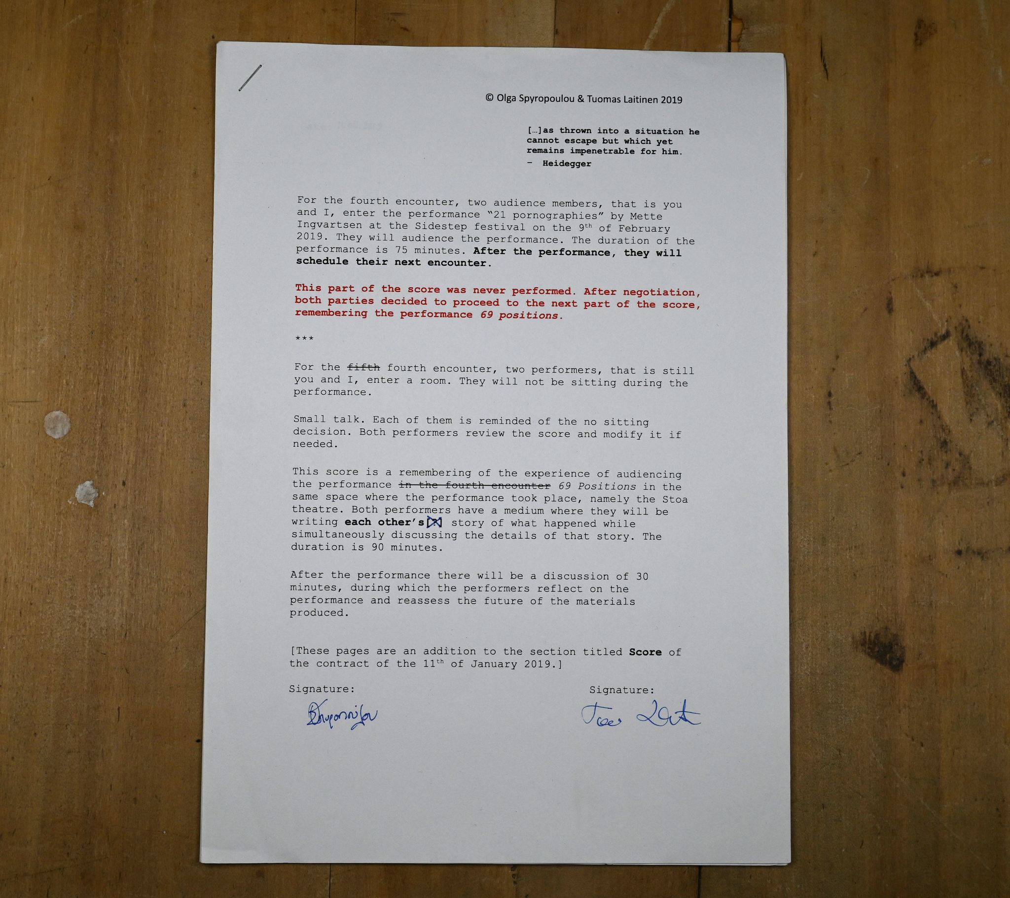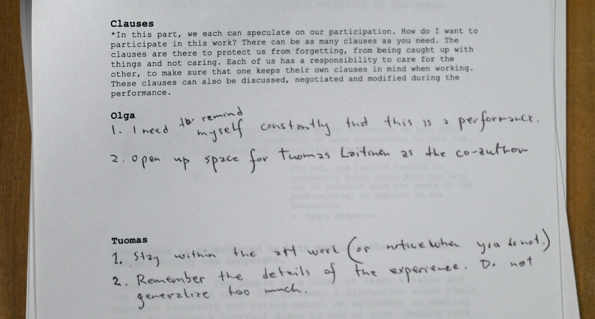 Draft 12 was realized in collaboration with the artist and student of Live Art and Performance Studies MA programme at Theatre Academy, Olga Spyropoulou. I was invited to work as her mentor. However, due to Olga’s wishes, it was more a collaboration than a hierarchical pedagogical relationship. One important feature of Olga’s work was making a contract between the two of us and then following it—as a form of participatory performance. We had shared a trip to Palestine and started our work with remembering a performance I realized there (see Draft 5). We drafted a contract, which dealt with realizing an experiment regarding the phenomenon of the audience. We aimed at searching for a limit of audiencing: realizing a performance where there would be no audience function at all. Below is a short version of the contract.
