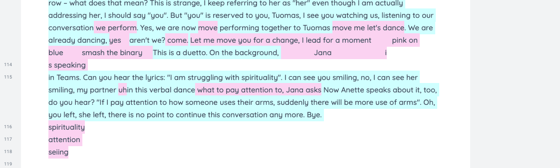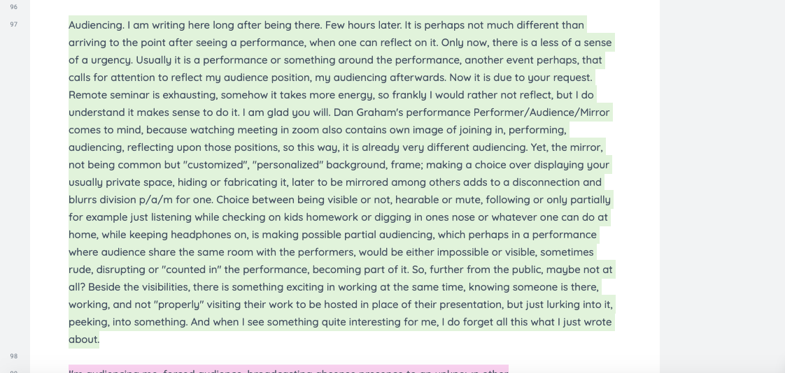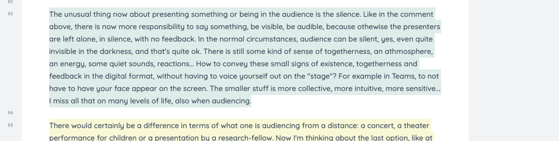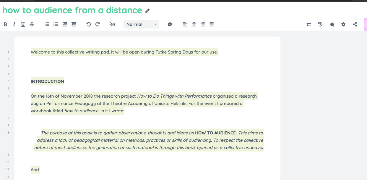 I had applied to take part in the Tutke Spring Days 2020 with the same notebook I used in Draft 10. The idea was to repeat the same thing in another event 17 months later. Due to the rapid spreading of the Covid-19-epidemic and the consequent closing of the university facilities the organizing team of Tutke Spring Days (doctoral candidates Kenneth Siren, Nanni Vapaavuori, Pauliina Laukkanen and Tuire Colliander) re-situated the event to the Microsoft Teams online environment. They asked also the presenters, if they were willing or able to realize their presentation remotely. I changed my original title how to audience into how to audience from a distance and replaced the physical notebook with a digital online one (at this point my use of the verb to audience was still careless. In this commentary, its definition is more narrow and I make a distinction between audience membership and audiencing). I situated the notebook in digital space using Etherpad, an open source online text editor.