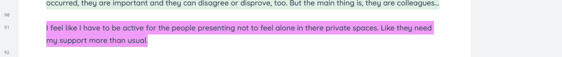The properties of the technology used for the event and their consequences for the audience were highlighted by several writers. This involved a choice of having your image visible for the others and if it was visible, the design of the background: the specific spot in your home environment, the possible changes you would make in it or a digital background hiding the space behind the person. The writers also emphasised the possibility to silence your microphone and the effects of the gate function of the video call software, cutting small sounds out.