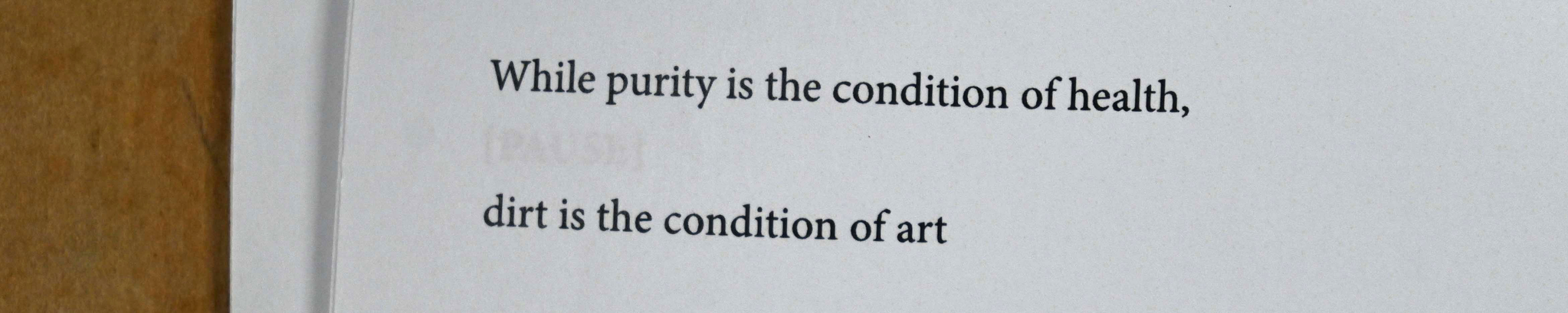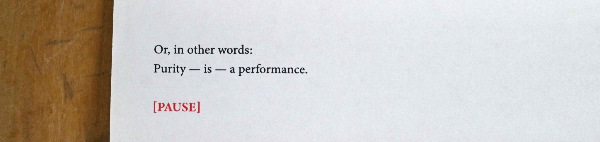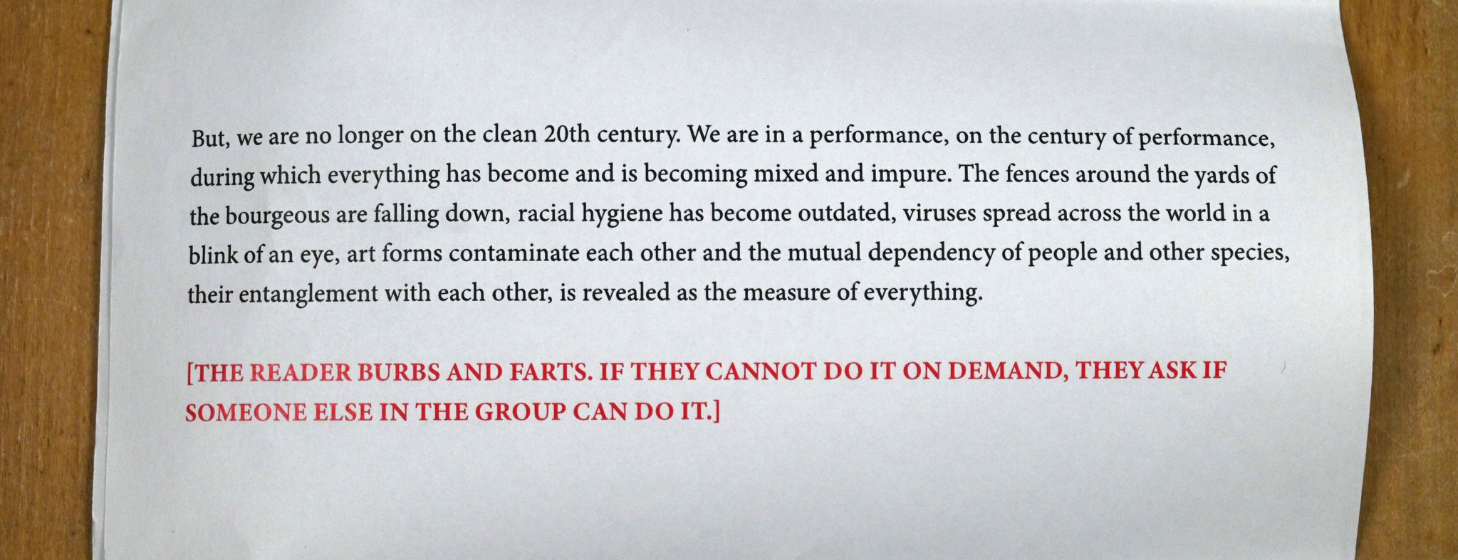 As a part of the programme available at the wagon, I prepared a letter performance titled Purity and Danger (available also in Finnish as Puhtaus ja vaara). The work was inspired by the perils that were linked with the genre of performance due to the Covid-19 epidemic. I borrowed the title of the performance from a similarly titled seminal book by anthropologist Mary Douglas (Douglas 2000). In the work I claimed that performance is the impurest of all art forms.