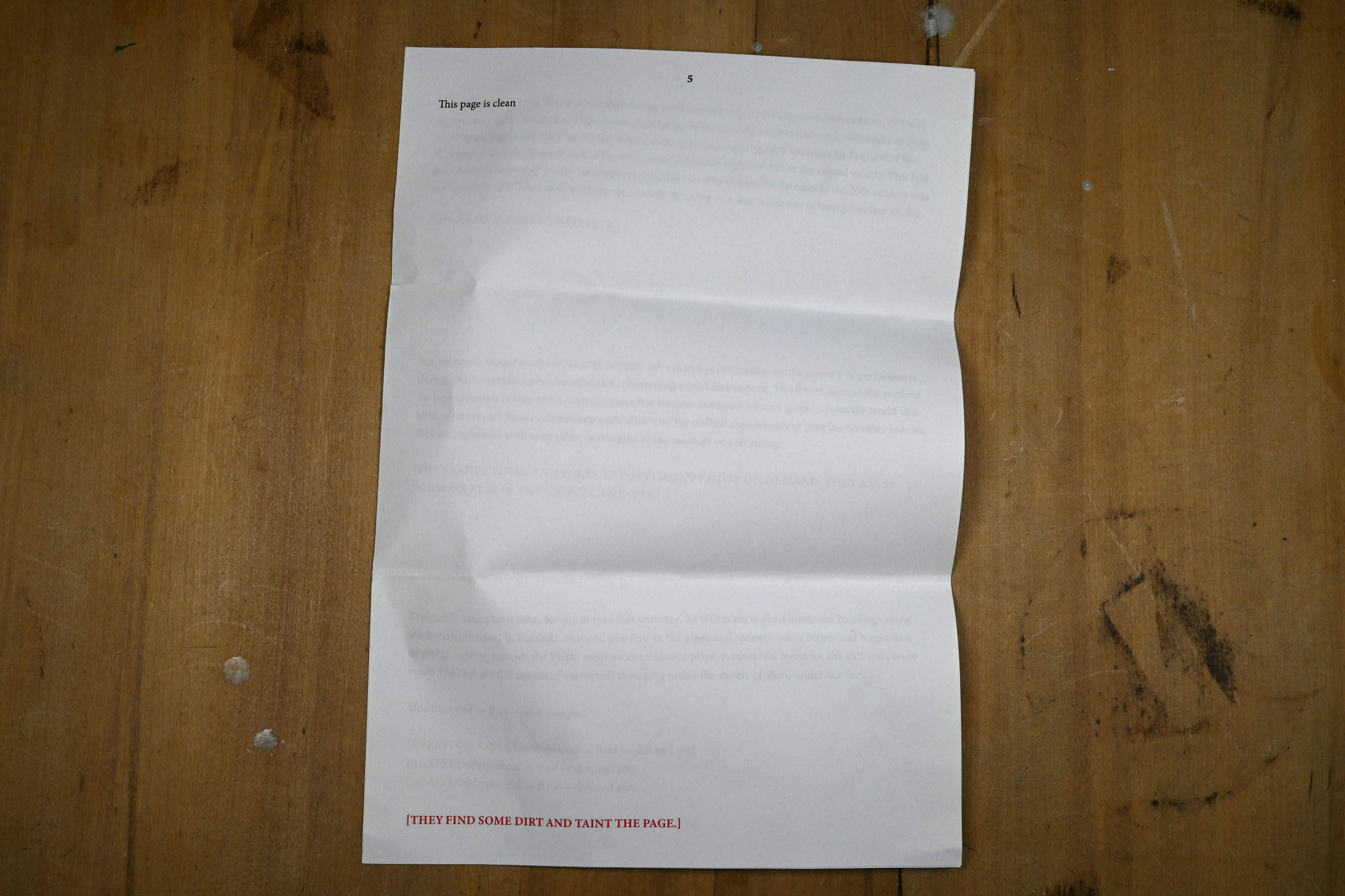 It was a playful score, suggesting things that were socially inappropriate, like spitting and farting. It explicated the contents of the rectums of the attendees and proposed chanting a creed of filth together. It was playing with the authority of the author: would the group consent to the playful proposals given in the letter or would they rebel against them. I would not know, since I did not feel like I could be present at the readings or document them. The feedback came in the form of ripped, crumbled, smudged and spit-on remnants of the letters.