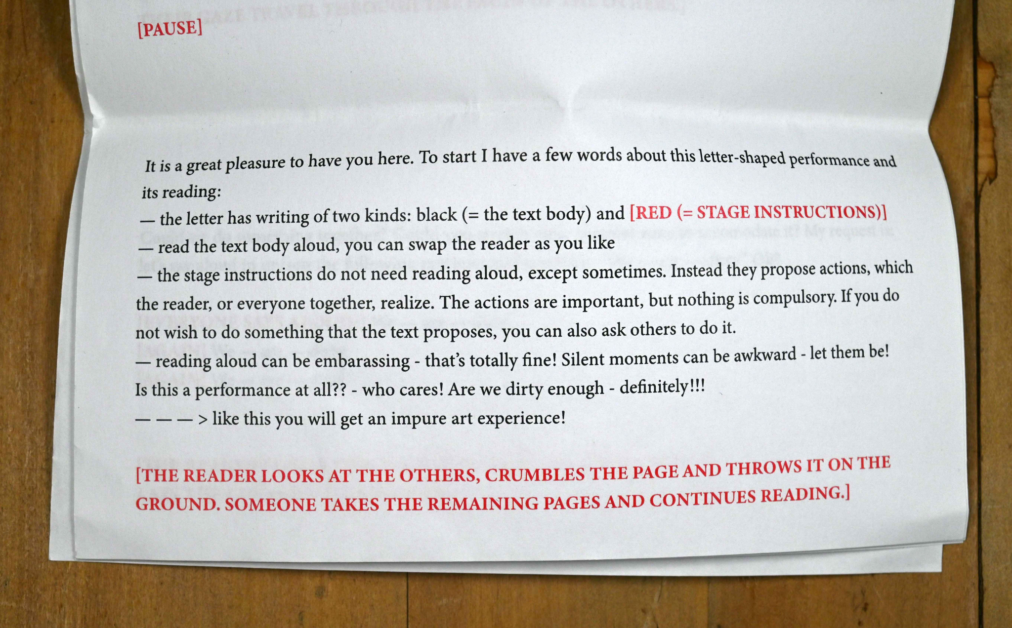 Continuing from the experience in Draft 22, also this one left the audience without the presence of the makers guiding the experience or witnessing that it really took place. The audience was left among themselves with the task of realizing the esitys/beforemance. However, in this draft the audience had explicit instructions, the temporal guidance provided by the letter, and they were asked to return the remains of the letter to the wagon after the event. The fact that these audiences nearly always returned the remains and these remains always consisted of different crumbled, smudged and ripped pages, made it clear that a liminal process had been realized and completed. The remains functioned as material evidence of the event, in which the audience had used the liberties provided by the authority of the performance, thus rendering themselves subordinate to it. They realized an esitys/beforemance, in which they took turns performing and then rejoining the membership of the audience body, re-iterating the dramaturgy of reading aloud used in Draft 11. The material evidence could at least in theory be used to trace the way the performance had progressed (although I never attempted such investigation).