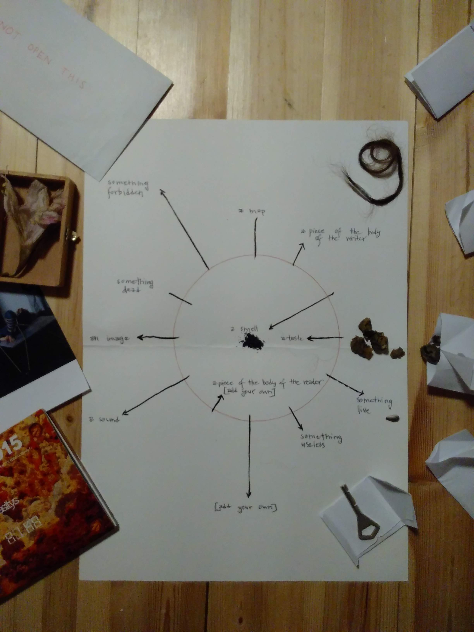 My aim was to design an experience that was structured but that lacked meaning, which in turn would be inserted by the recipient. I used symbolic elements that could have significance to the recipient regardless of their personal background (I thought that qualities like dead and alive, smell and taste, forbidden and useless would have meaning to almost anyone). If the recipient would try to realize the score, it could result either in a private ritual experience or a public performance, or something in between.