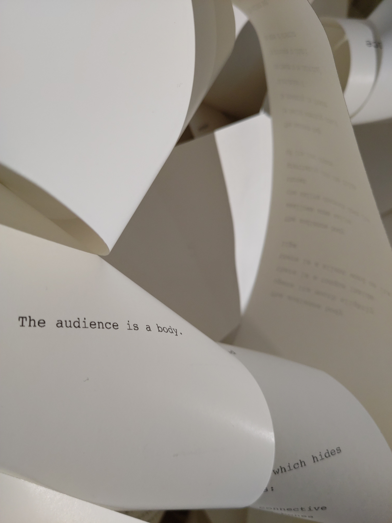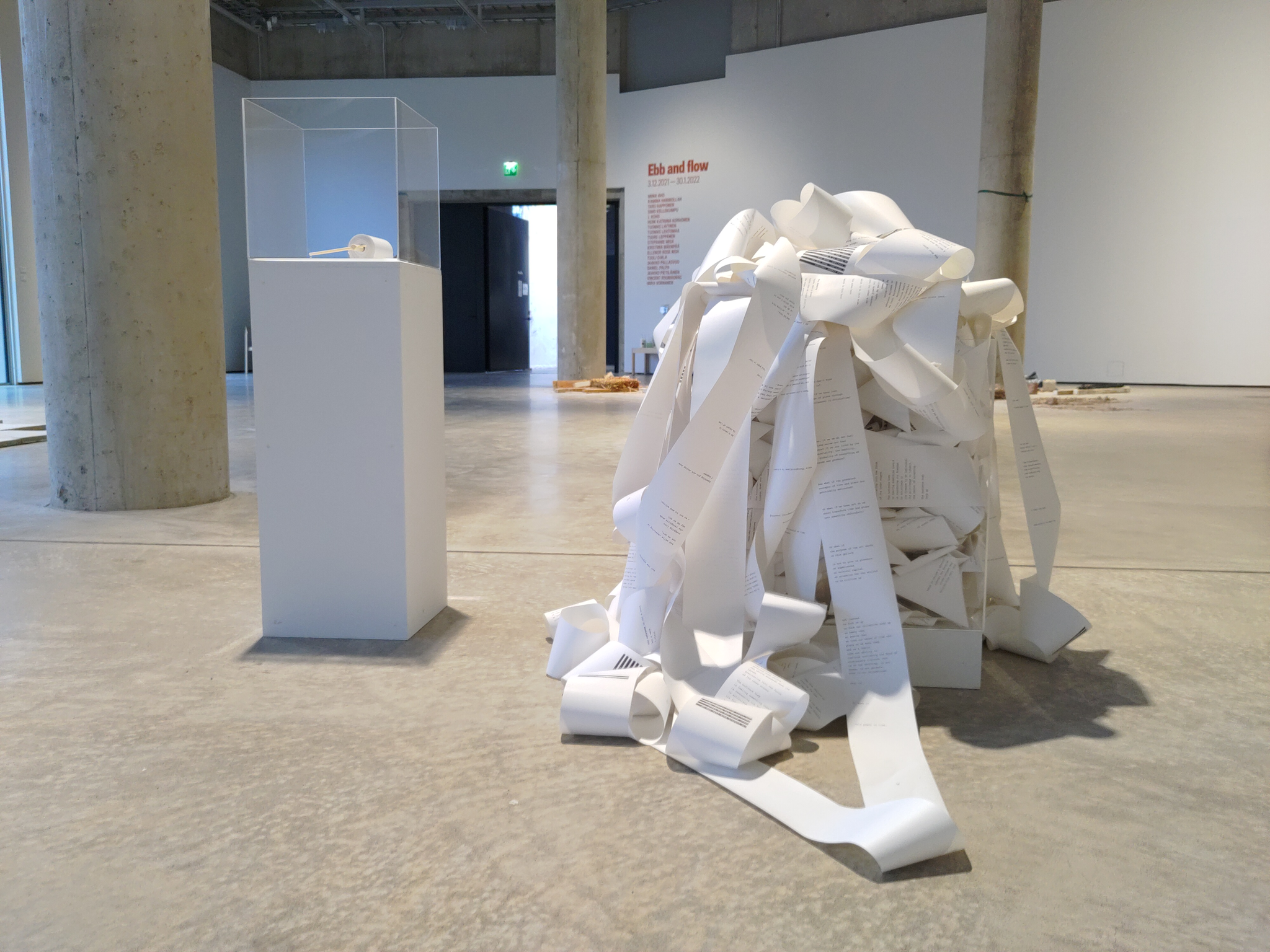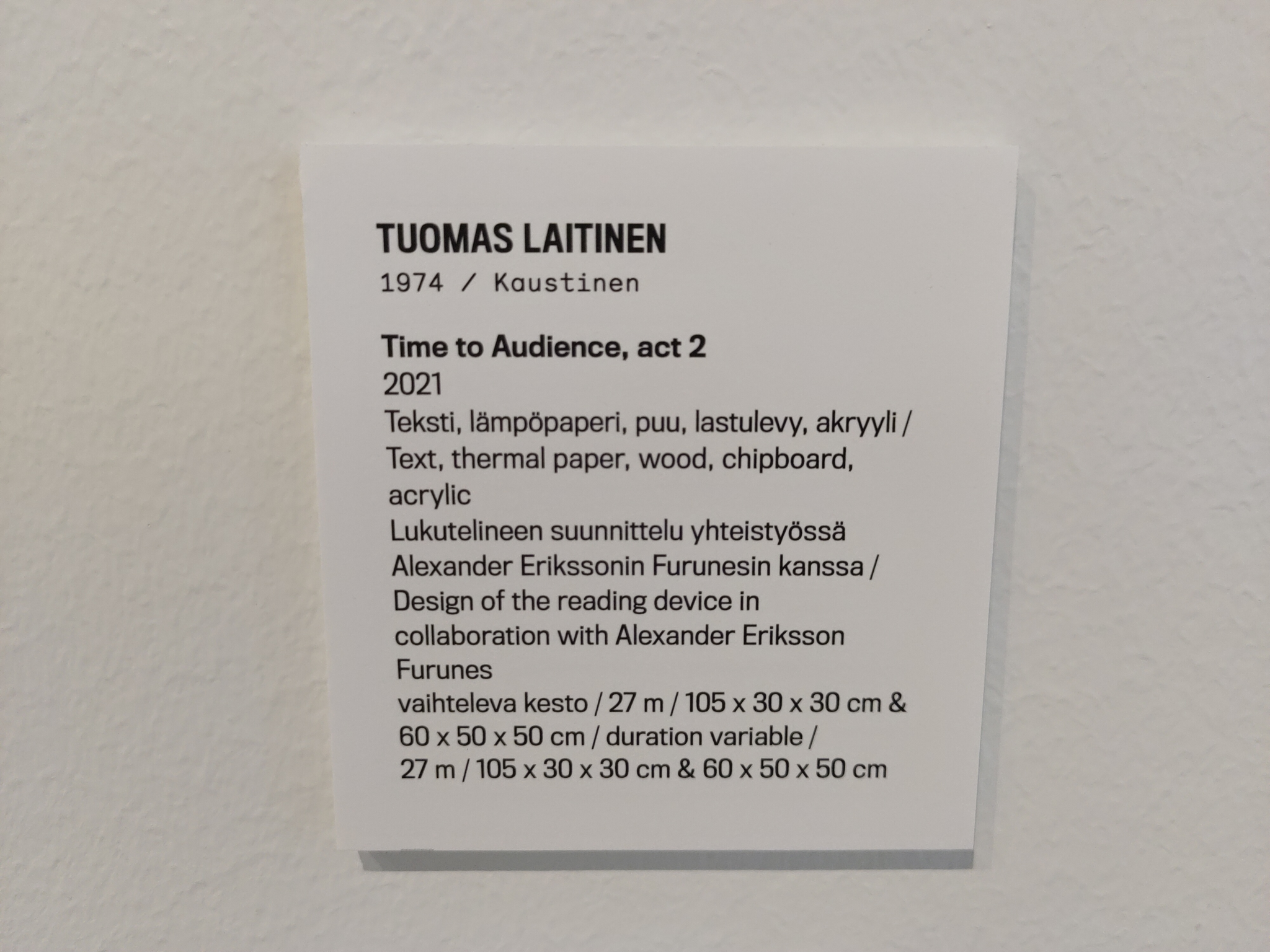 Time to Audience, Act 2 took place in the exhibition Ebb and flow, which opened the Kuva/Tila gallery at the brand new Fine Art Academy building in December 2021. I was invited to take part in the exhibition by curator Riikka Thitz, who made her MA thesis on dramaturgy as a tool of curation (Thitz 2021) and was interested in the relationship of the media of performance and exhibition.