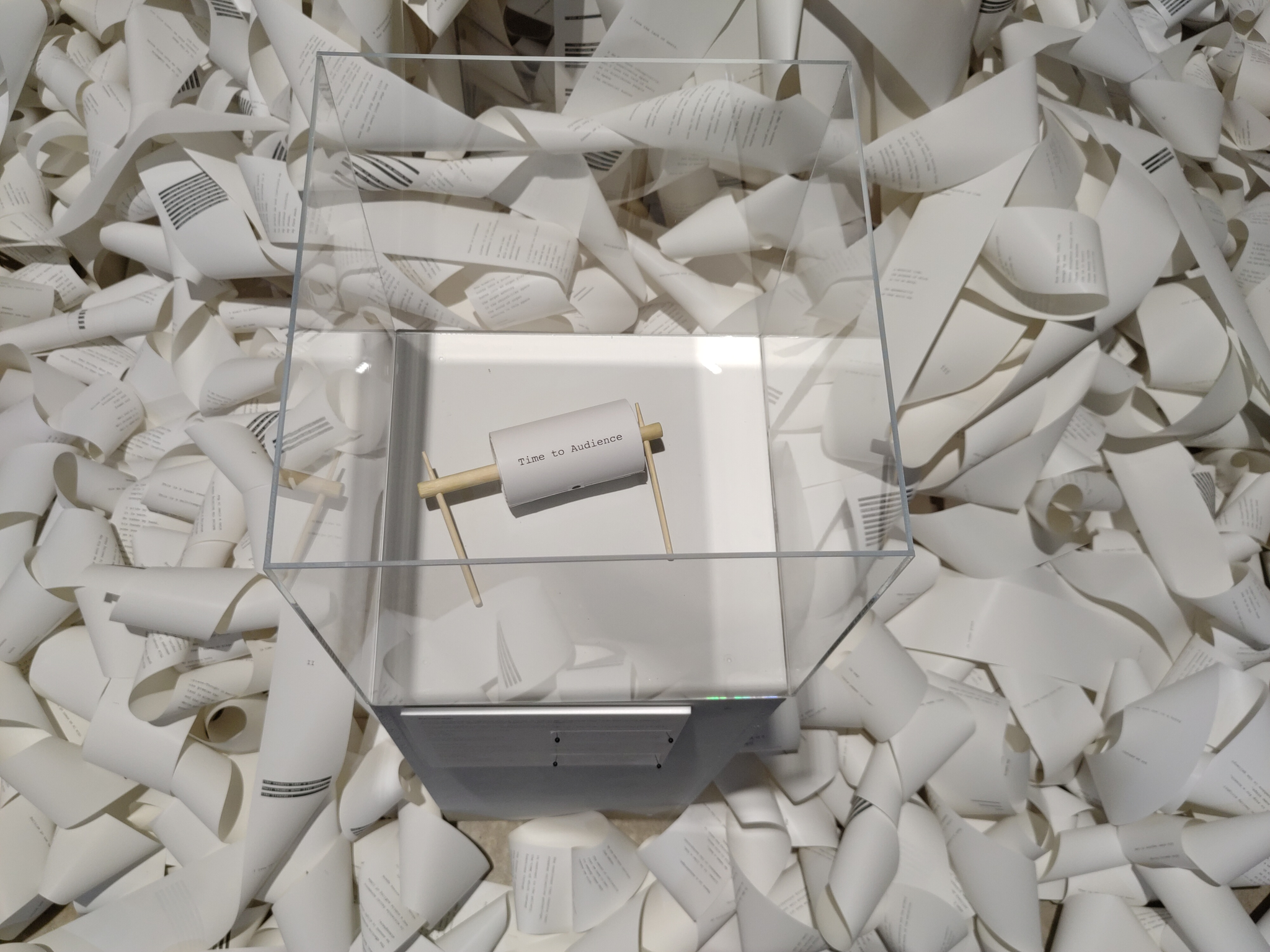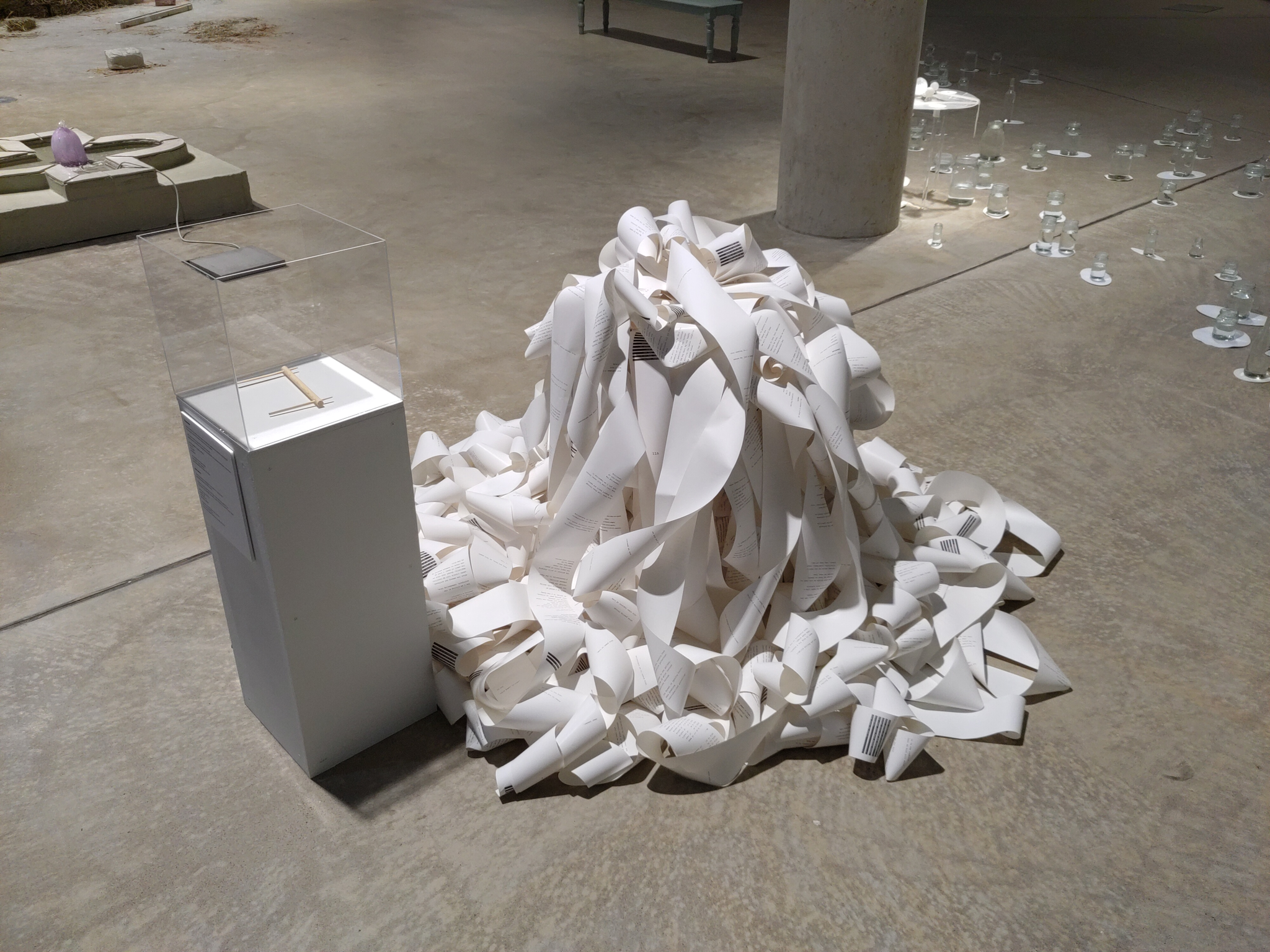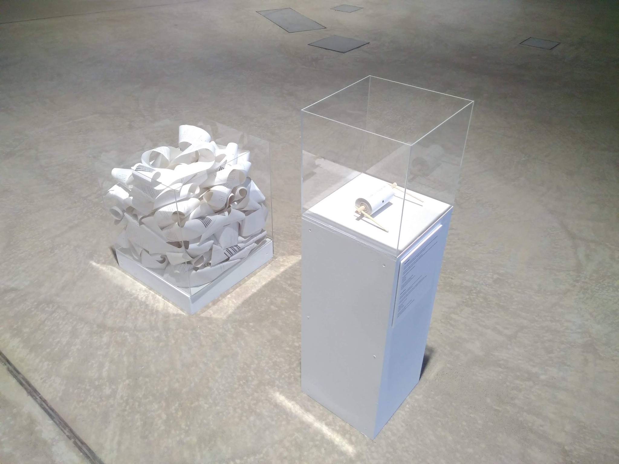 Like Act 1, also Act 2 was composed of 40 rolls. This time these rolls were distributed across time, along the 40 days the exhibition was open. Each day, there was one roll available for the audience to read. I prepared two pedestals with an acryllic cube on each of them. The higher cube was holding the unread rolls, one each day. Reading the roll required unwinding it; the lower cube was for the unwound rolls. The time of the exhibition was visible as the paper strips accumulated in the larger cube.