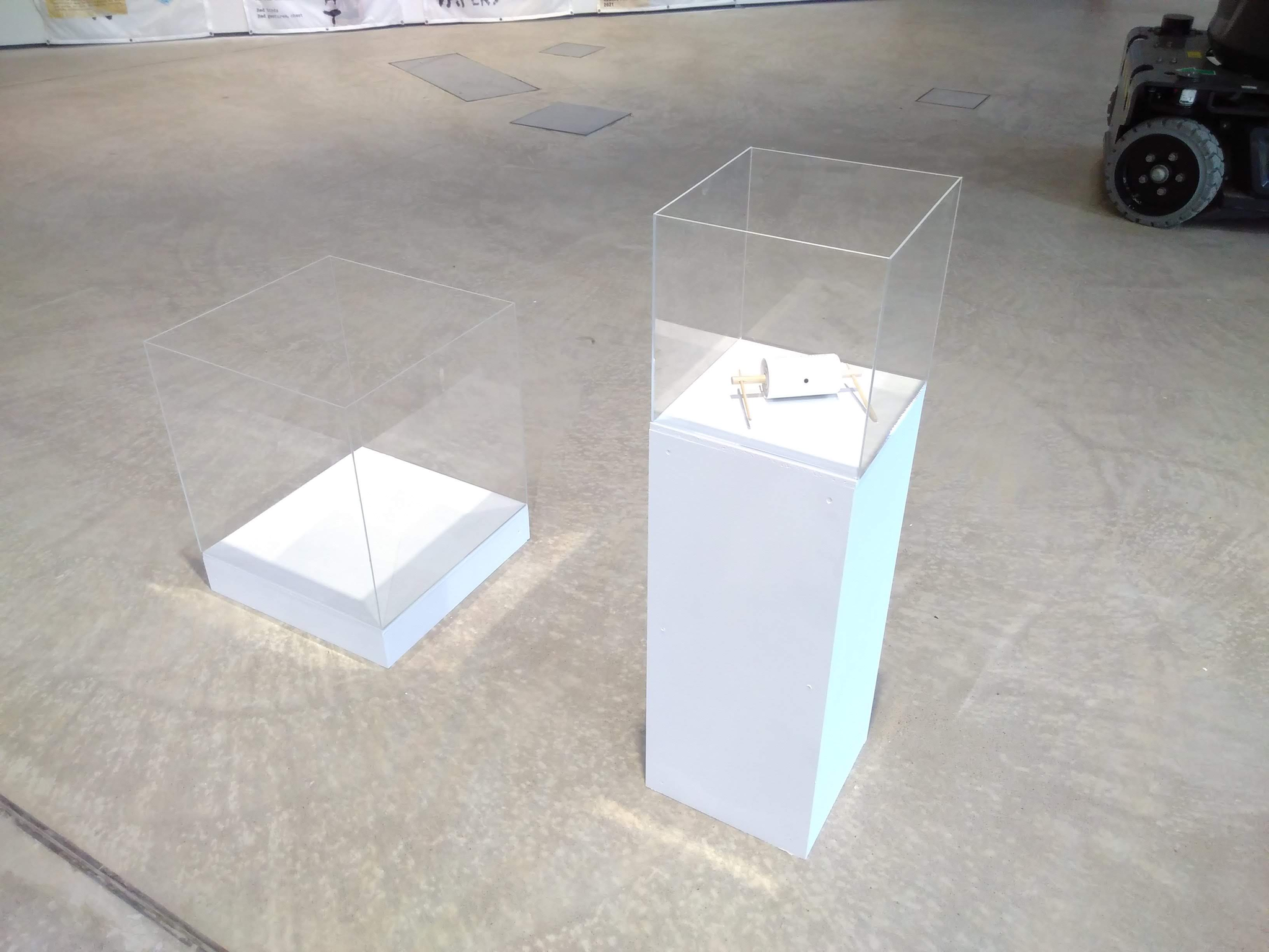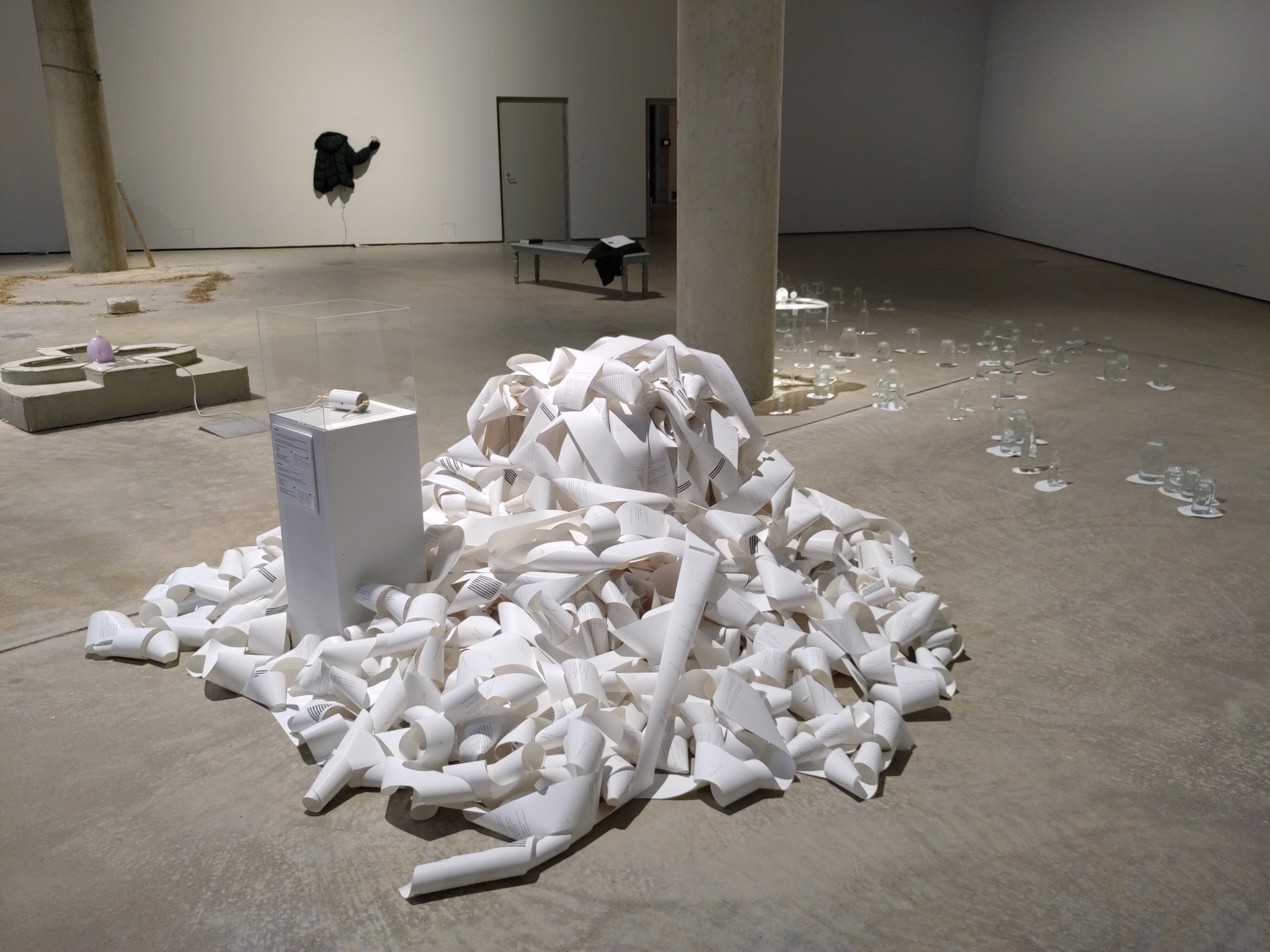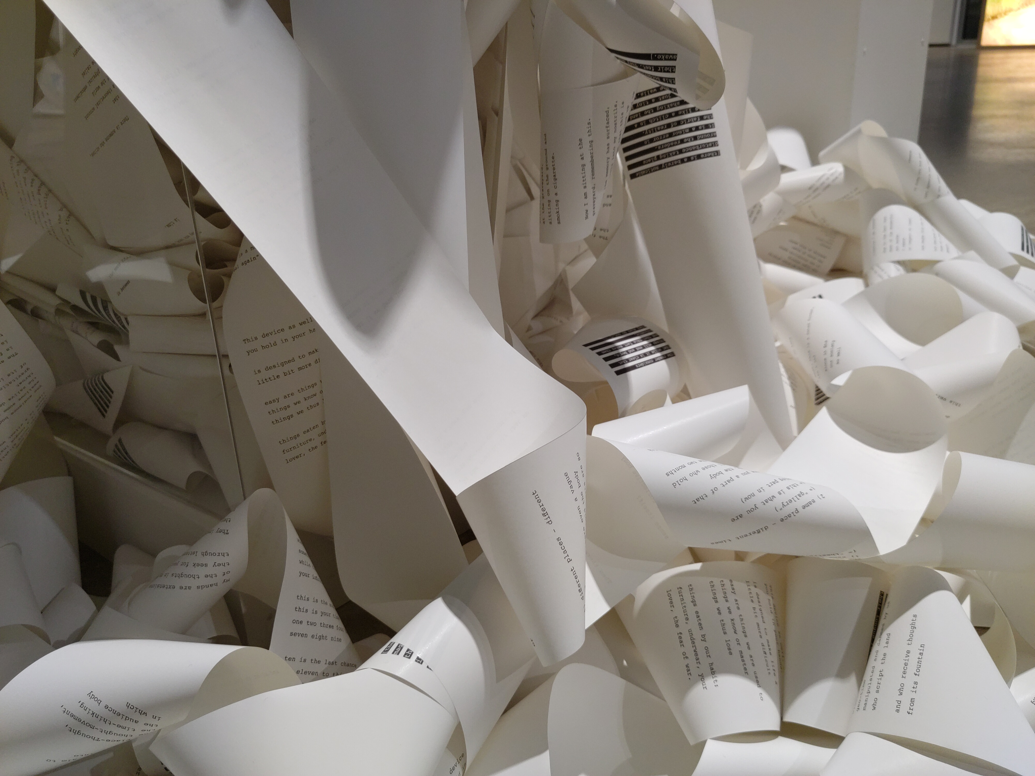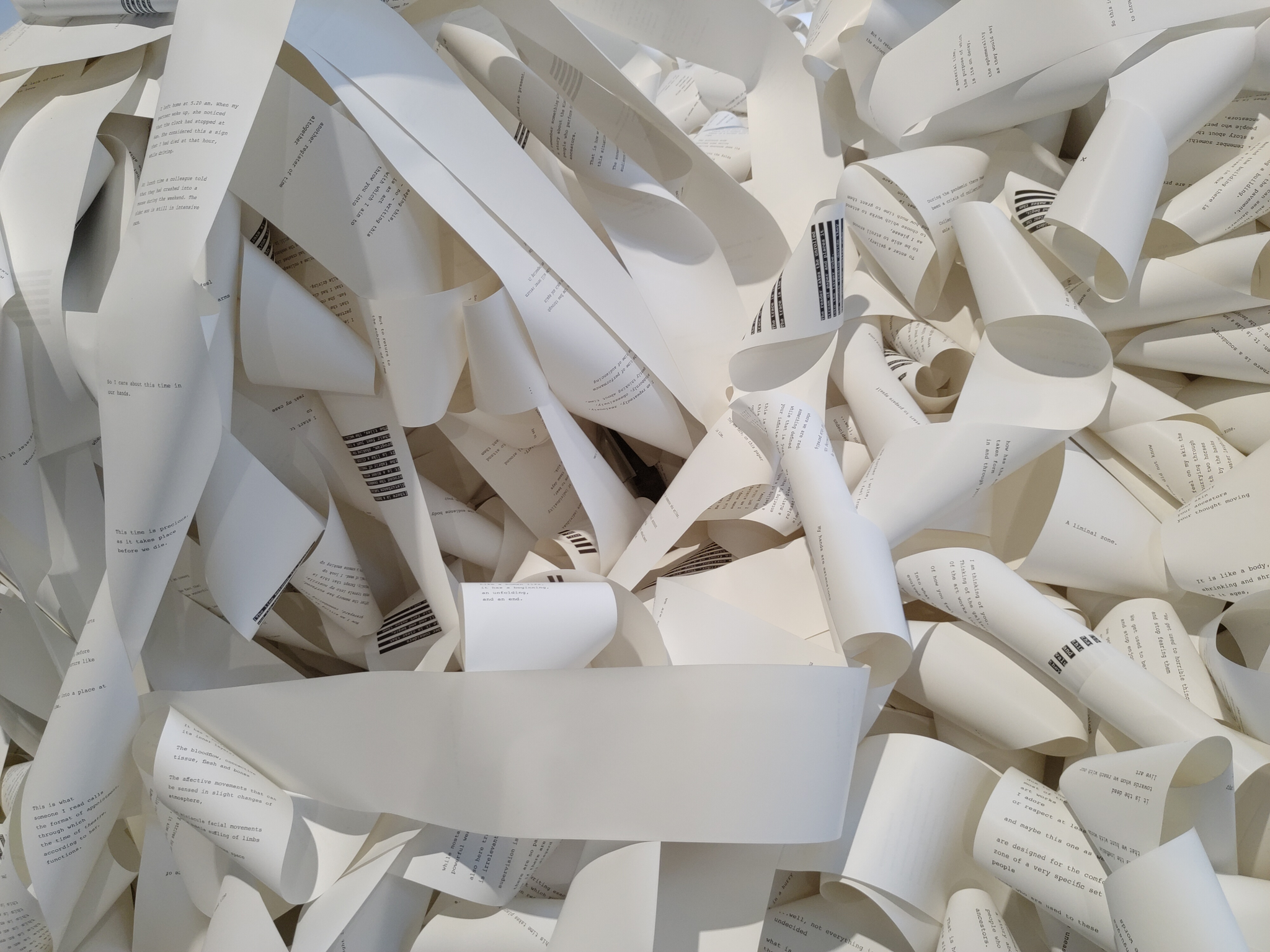 Like Act 1, also Act 2 was composed of 40 rolls. This time these rolls were distributed across time, along the 40 days the exhibition was open. Each day, there was one roll available for the audience to read. I prepared two pedestals with an acryllic cube on each of them. The higher cube was holding the unread rolls, one each day. Reading the roll required unwinding it; the lower cube was for the unwound rolls. The time of the exhibition was visible as the paper strips accumulated in the larger cube.