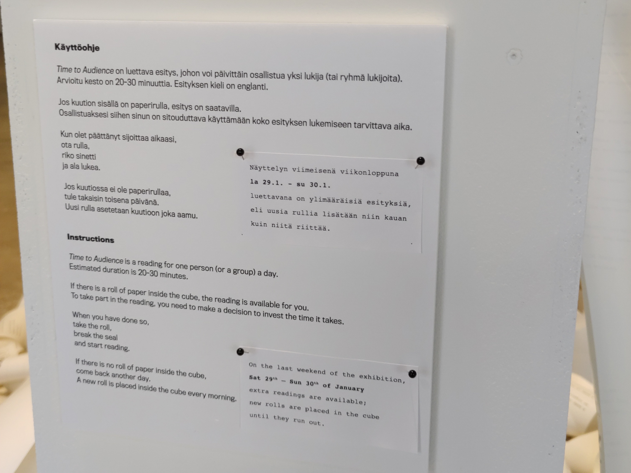Continuing from the Purity and Danger (Draft 25), I was working on making the course of time during an esitys/beforemance and the related transformation visible and tangible. The phrase “this paper is time”, used already in the first act of Time to Audience, was even clearer than before. This was also my contribution to the temporal structure of the exhibition format which typically seemed to let artworks stay untouched and unchanging. Curator Thitz’s agenda invited these kinds of gestures. My aim was to make the impact of the audience both a necessary and an aesthetic part of the work, rendering it suitable for the genre of esitystaide/beforemance art, even if it was presented in the format of an exhibited artwork with no performers and utilizing the format of opening hours.
