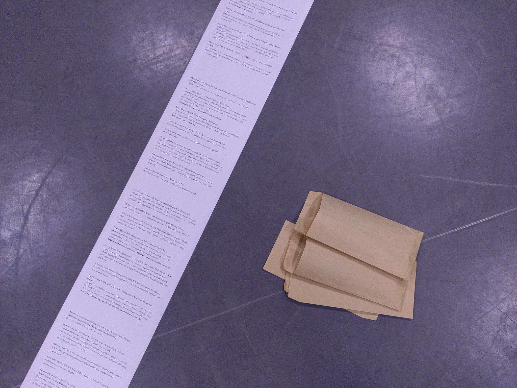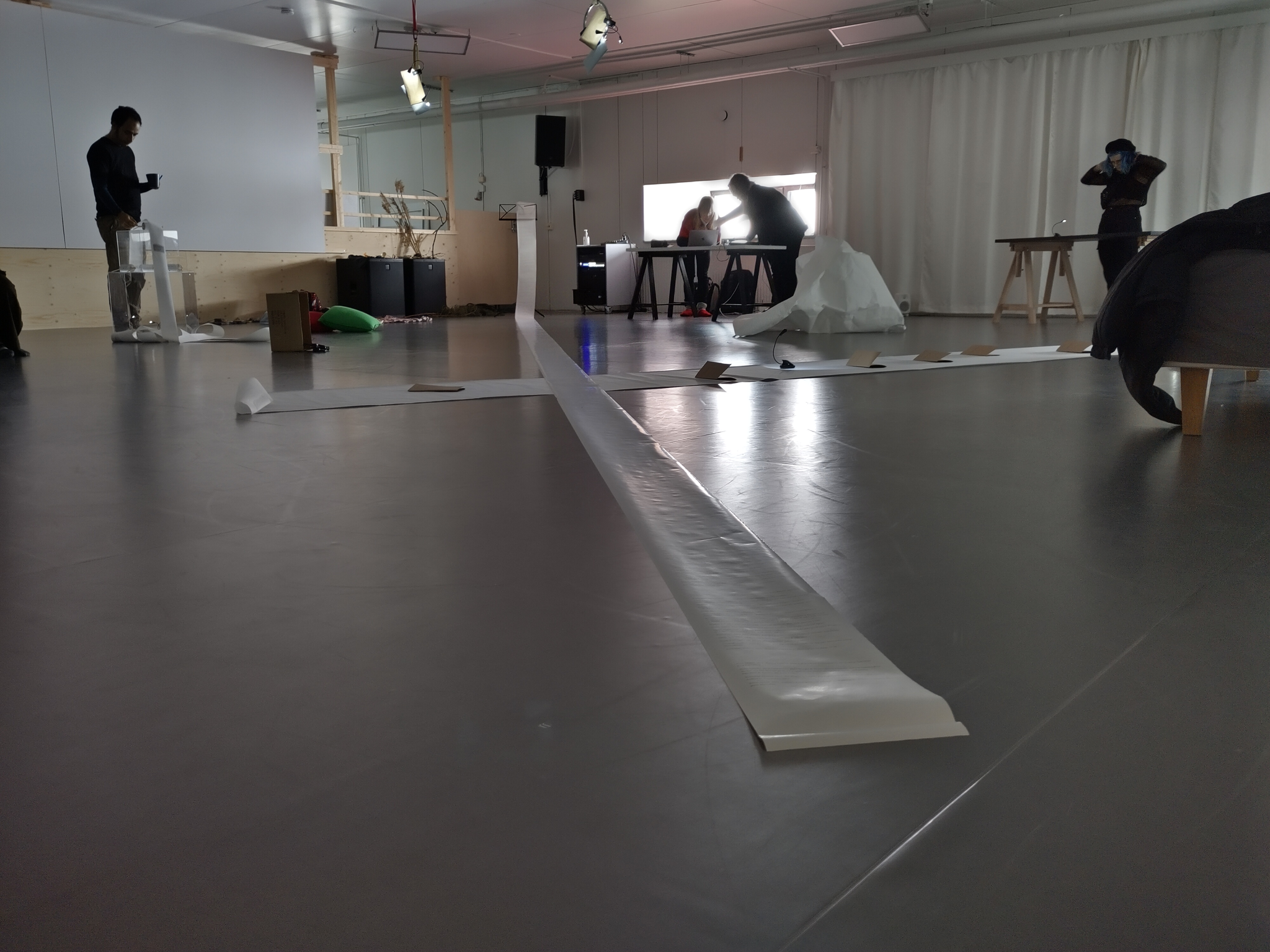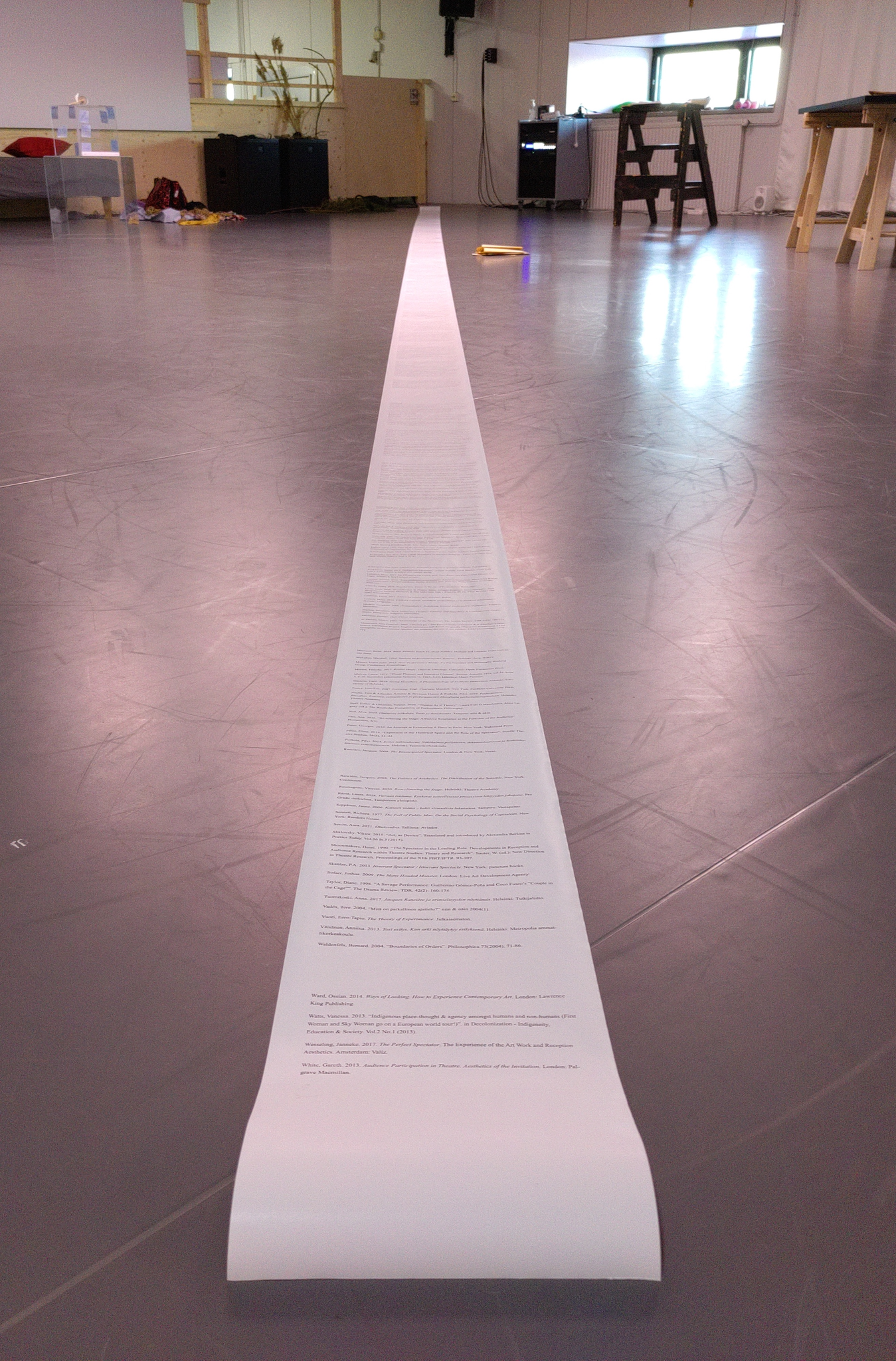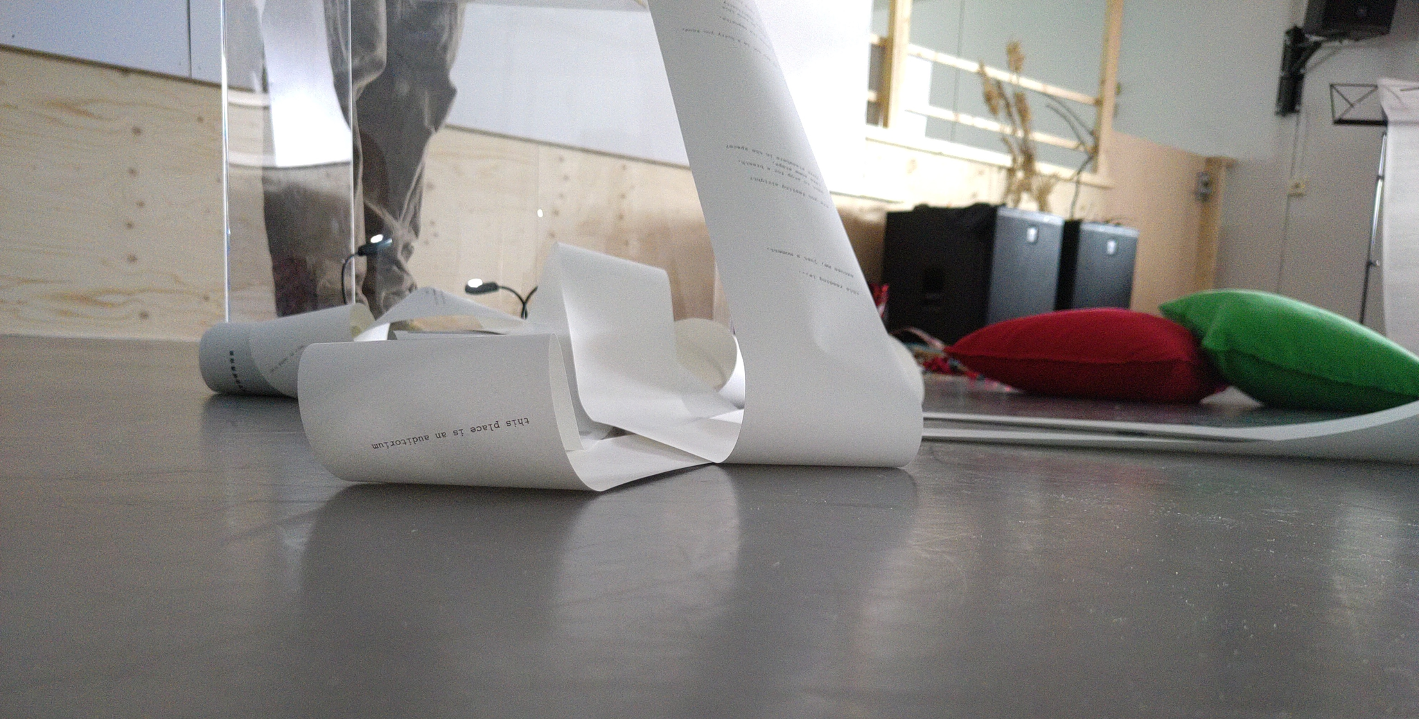 I shared the residency with Karolina Kucia, Siiri Viljakka, Elie Halonen, Satu Hakamäki, Pia Palme, Carlos Zerpa and María Alejandra Rojas (who took part remotely). Each Tuesday one of us would present their work and we would discuss it. For my presentation on the 5th of April, I prepared the first version of what would evolve into Audience Body. It was an installation composed of a letter, a paper roll, a large book and a set of scores—almost the same basic structure that was present in the final piece: