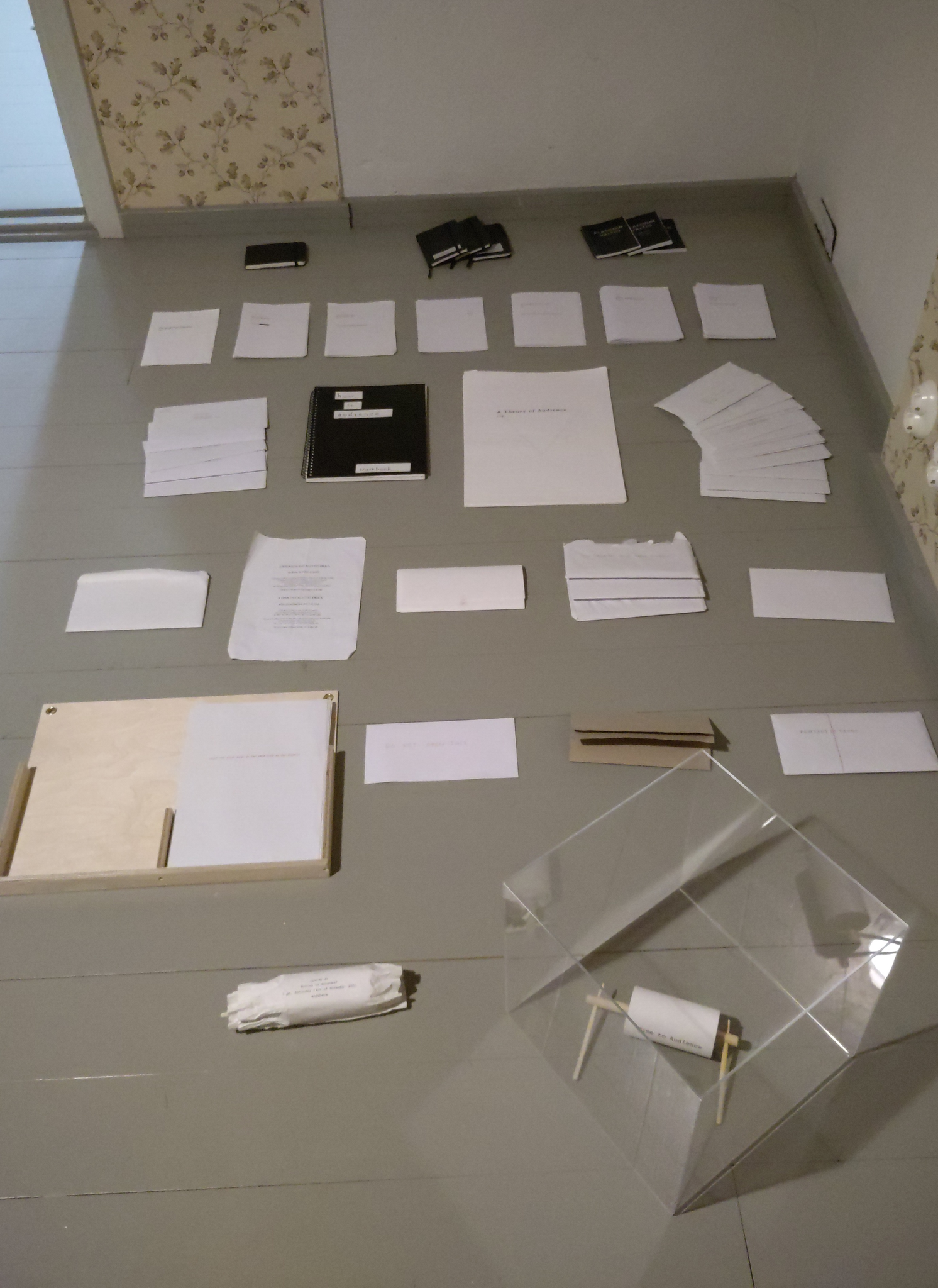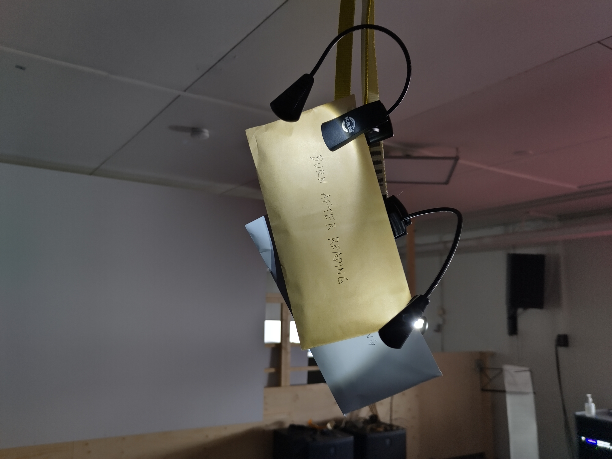 In terms of motifs and methods, gathering different formats into a larger composition developed my tendency further to relate the experience of reading to the content of the text. For example, the temporal modality of performing arts was present in the roll, which dealt with the flow of time, as well as in the Burn after Reading-letter with its ephemeral, self-destructive quality. By addressing different aspects of audience membership through different experiential components I began to aim at creating a space in which these experiential aspects could be accessed simultaneously by the collective body of an audience.