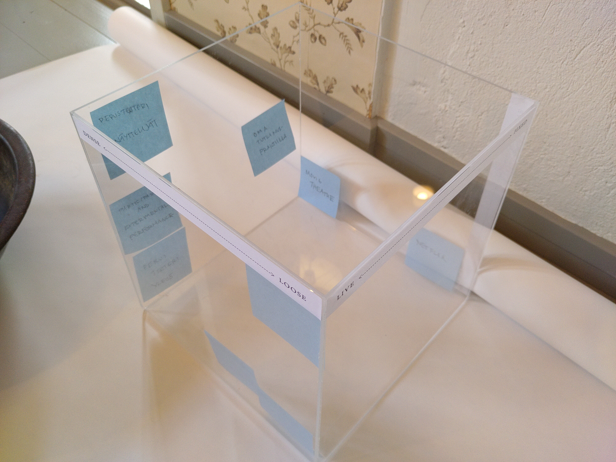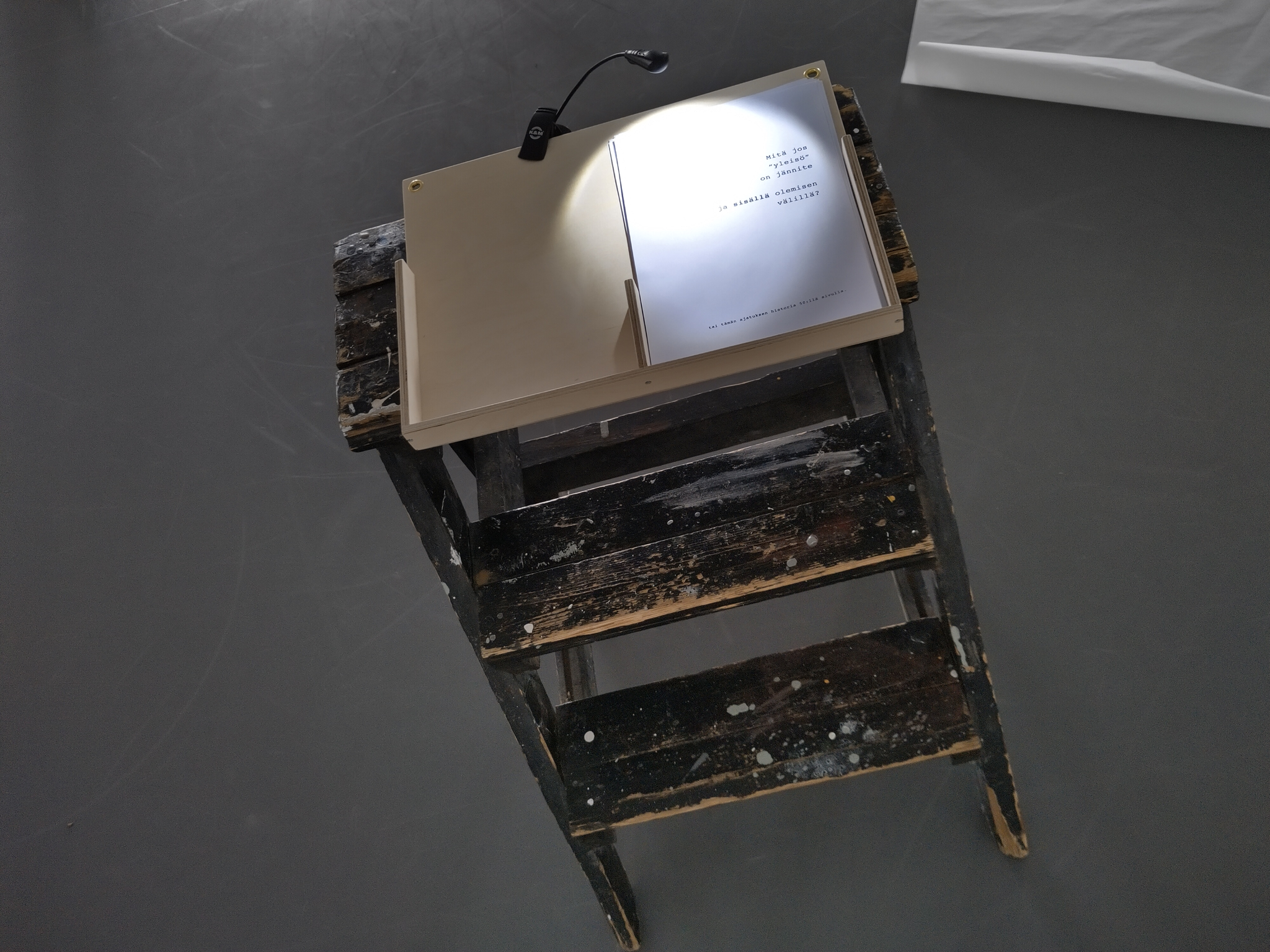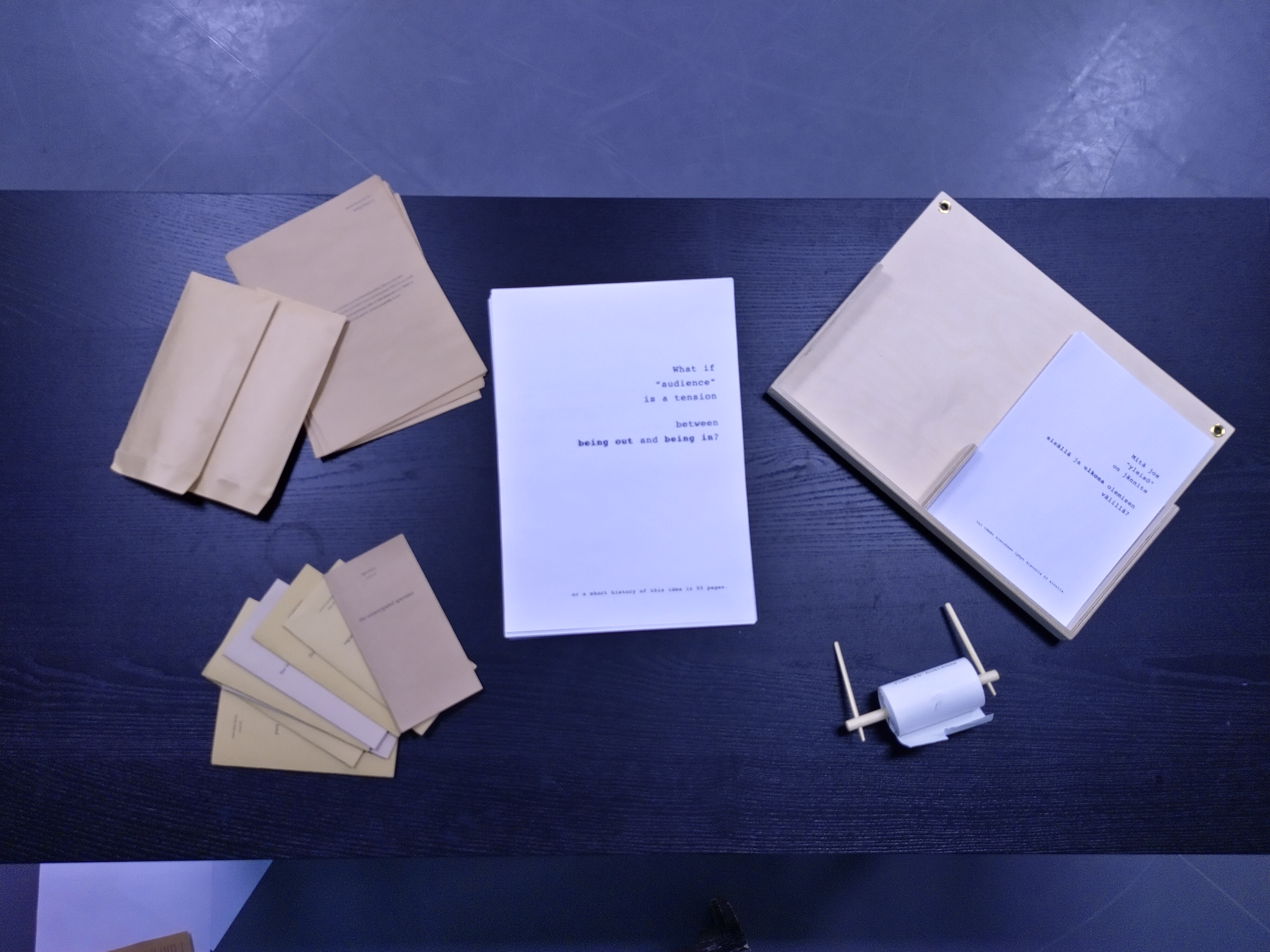 - What if Audience Is a Tension between Being In and Being Out—a script based on the second act of A Reading of Audience (the first examined artistic part). The script was available in Finnish (A4-sized, on a plywood tray) and in English (A3-sized, on a table)
