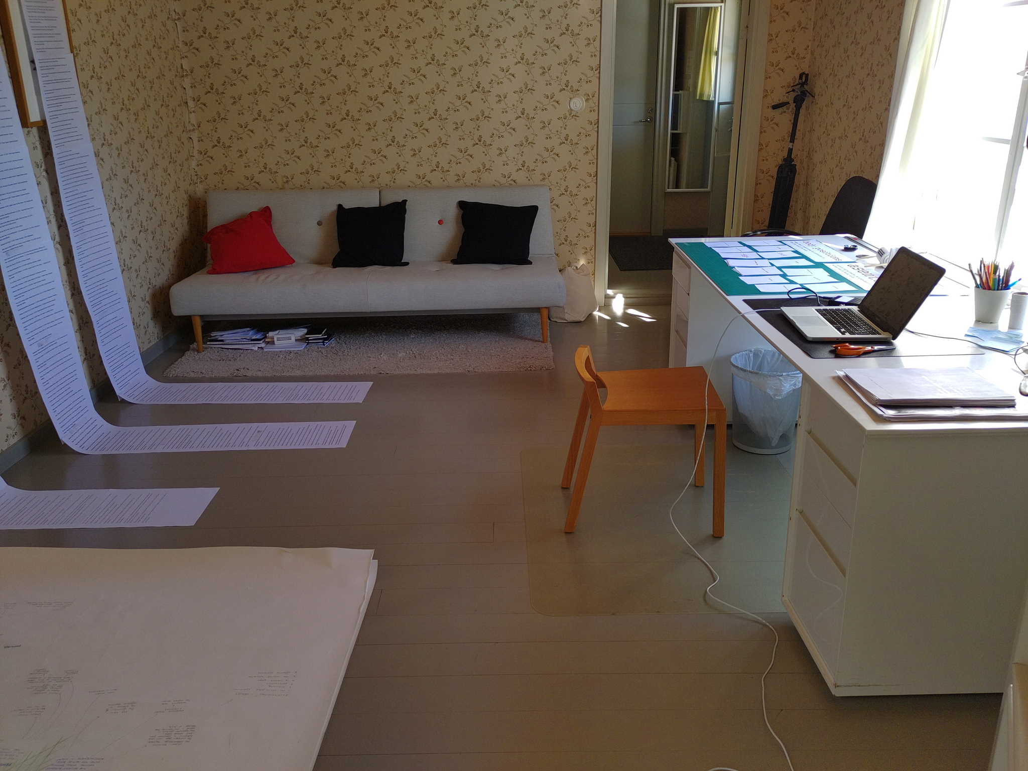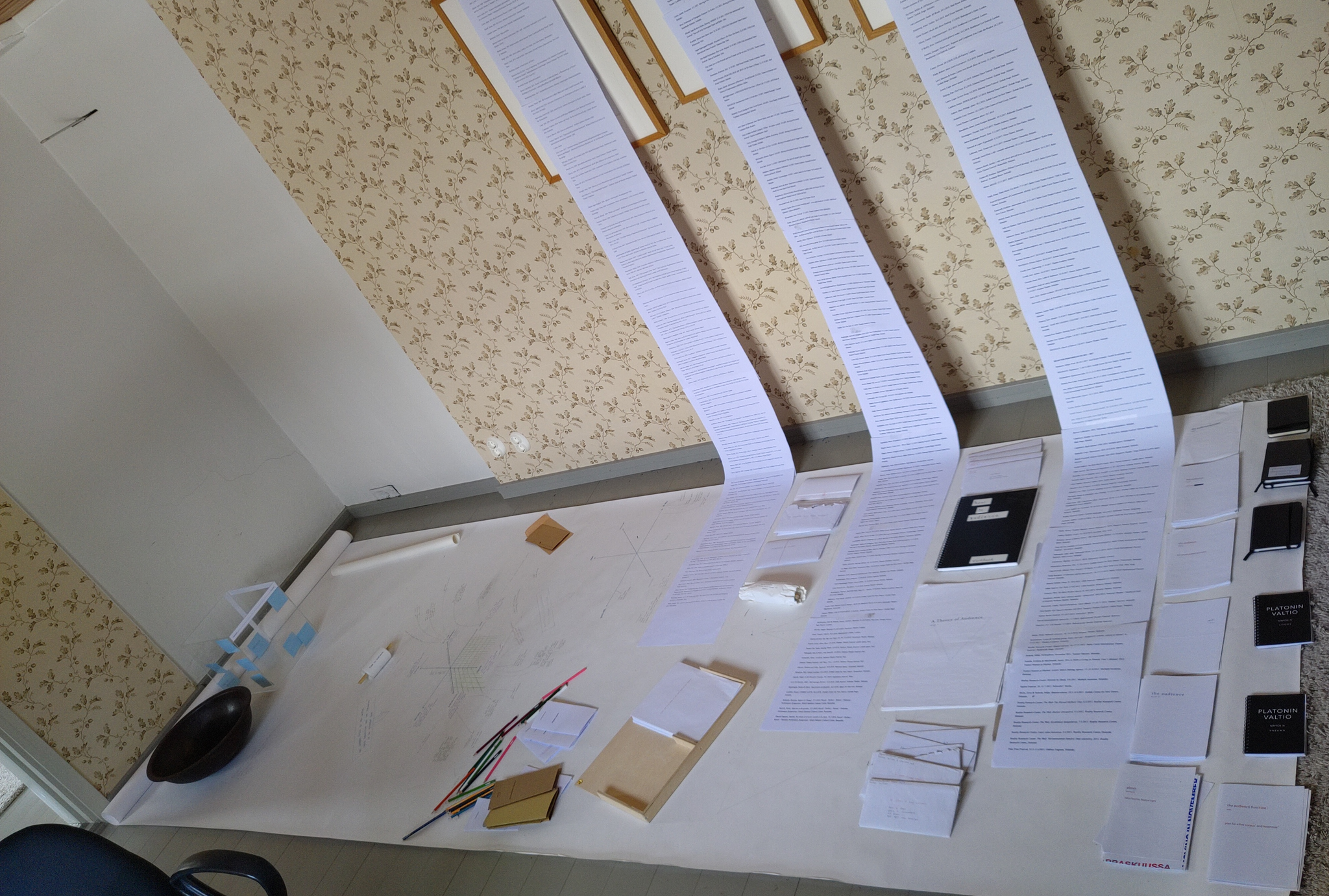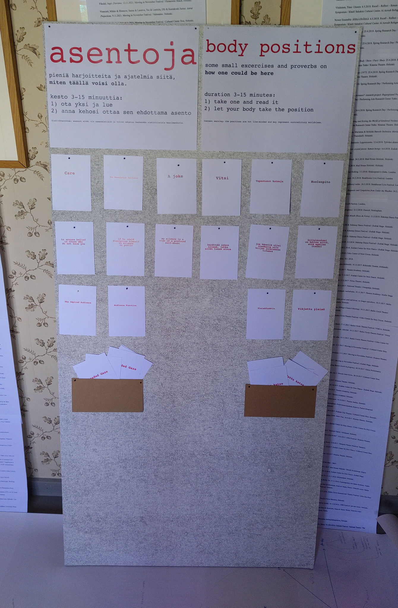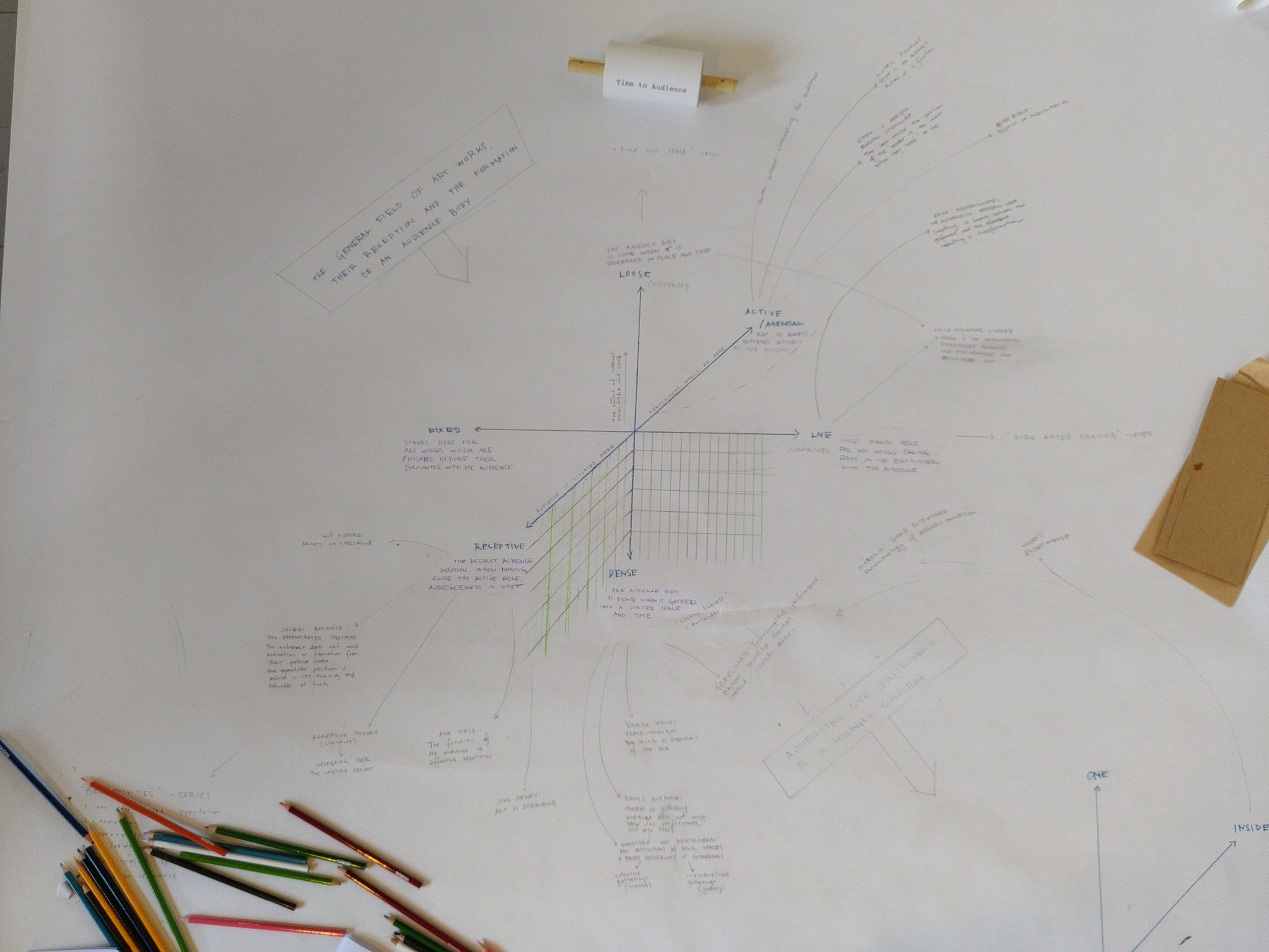 - What if Audience Is a Tension between Being In and Being Out—a script based on the second act of A Reading of Audience (the first examined artistic part). The script was available in Finnish (A4-sized, on a plywood tray) and in English (A3-sized, on a table)