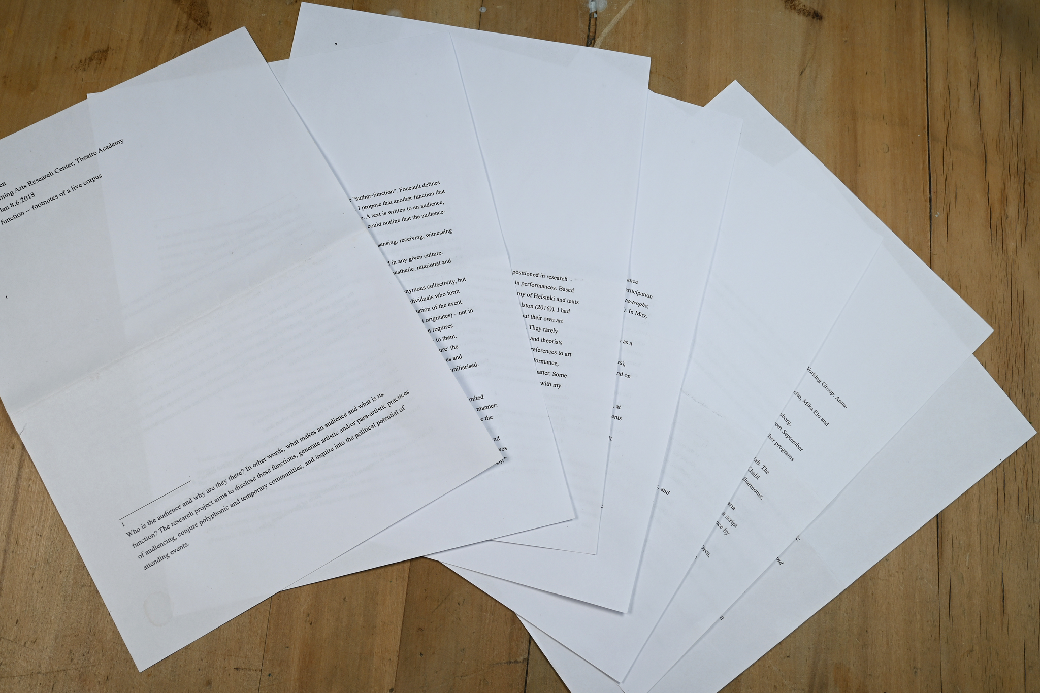 This method parallelled my attempt to defer from staging something: with this gesture I deferred from writing a body of text (which would take the center of attention) and instead shift attention to the periphery of the page (as if from the stage to the auditorium). This format was thus to contribute to the polarity of outside and inside. I also wanted to express that my main interest are the live events, which escape the page and my writing can be only sidenotes to those events.