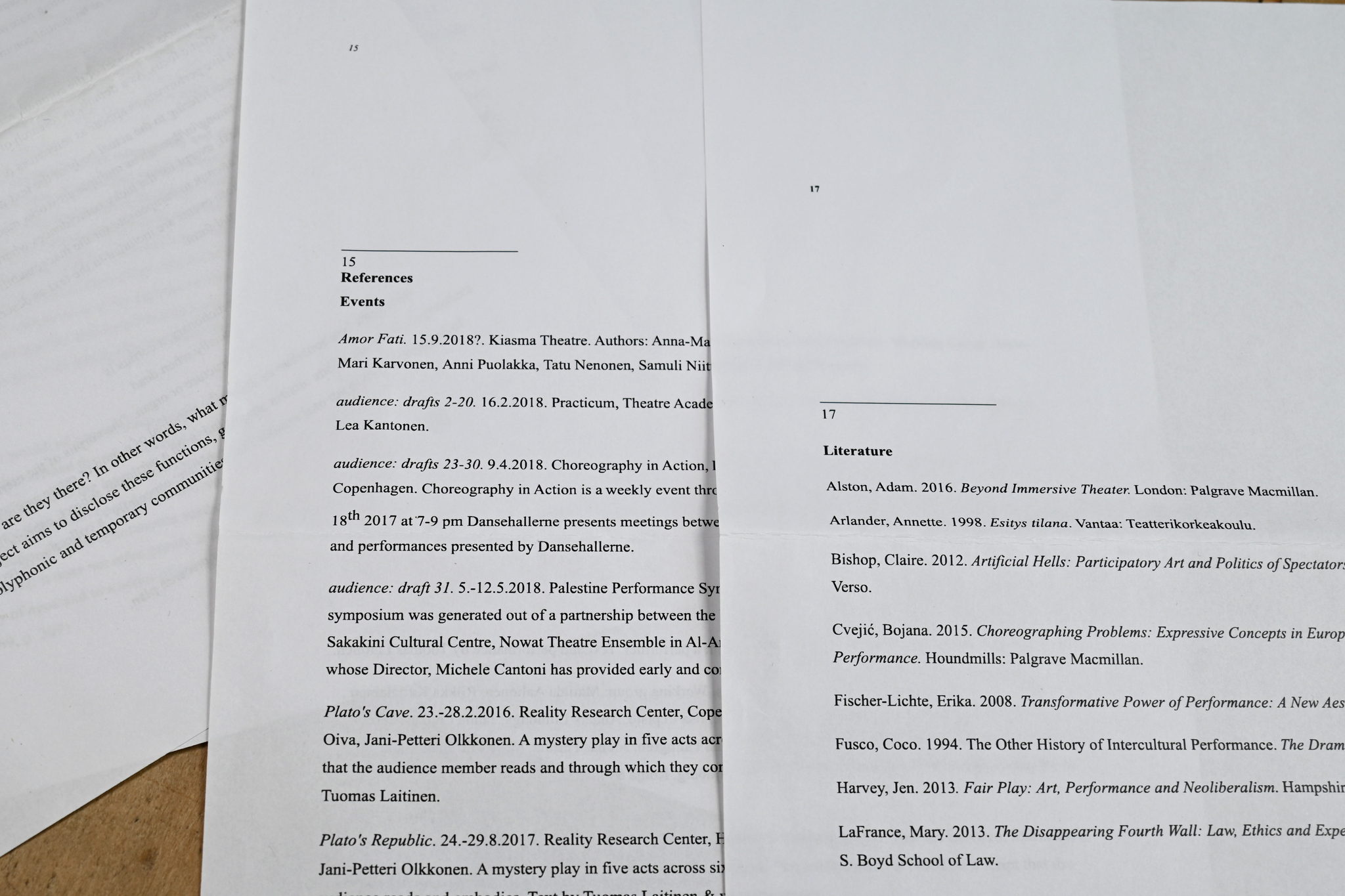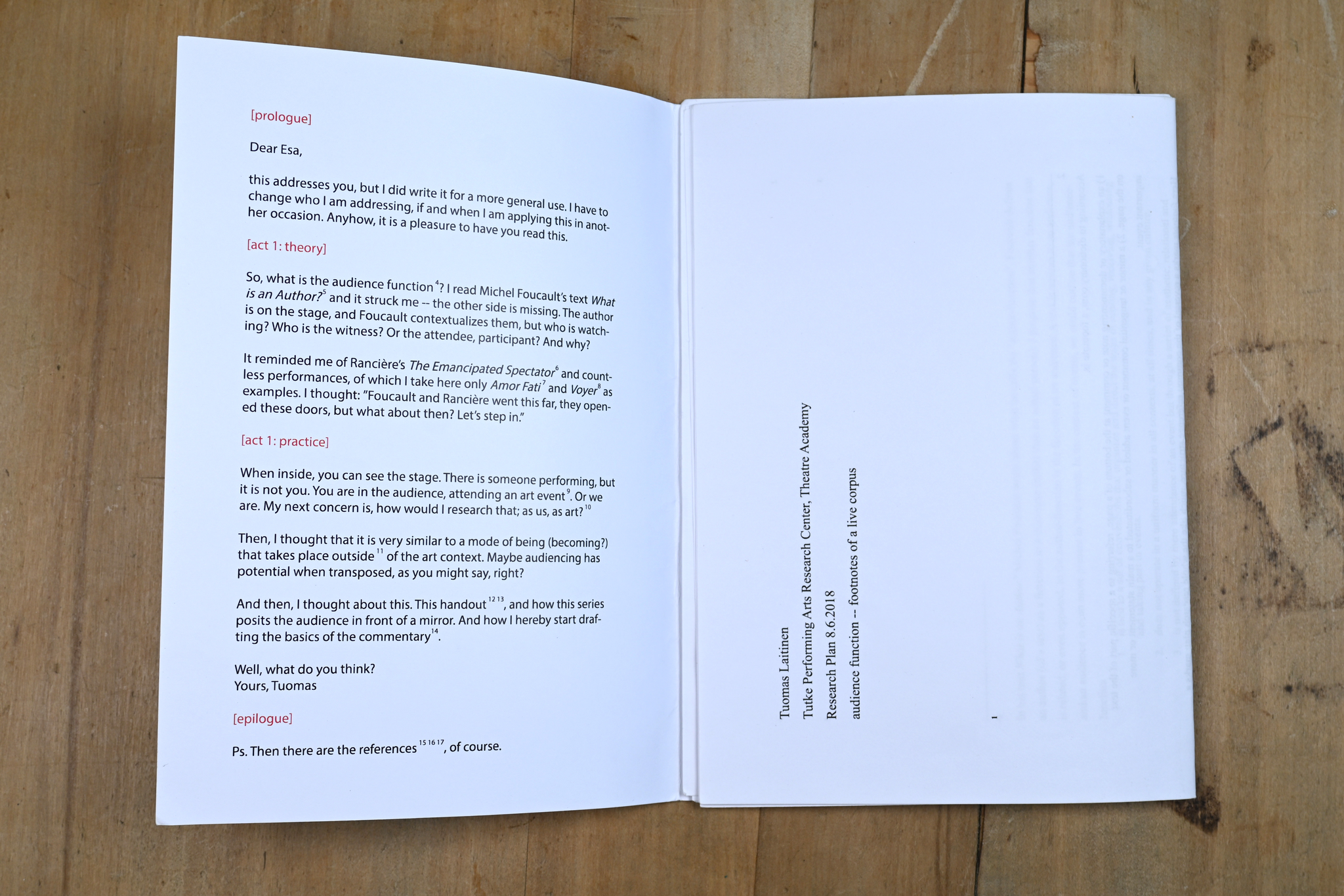 In June 2018 I started to branch out from the simple format of a folded A4 programme print. Artist-researcher Esa Kirkkopelto had started as the first supervisor of my doctorate and I prepared a re-iteration of my research plan for him to read. It was composed of two parts. The first was a programme similar to the previous Drafts 2, 4 and 5. The programme was the “text body”, which contained 17 footnote numbers as superscript entries. In between the programme, there was a 13-page research plan printed on A4 sheets and containing only footnotes, which respectively referred to specific words or sentences in the text body printed in the programme. I slipped the folded programme and the footnote document into an envelope and left it by the door of Esa’s office.