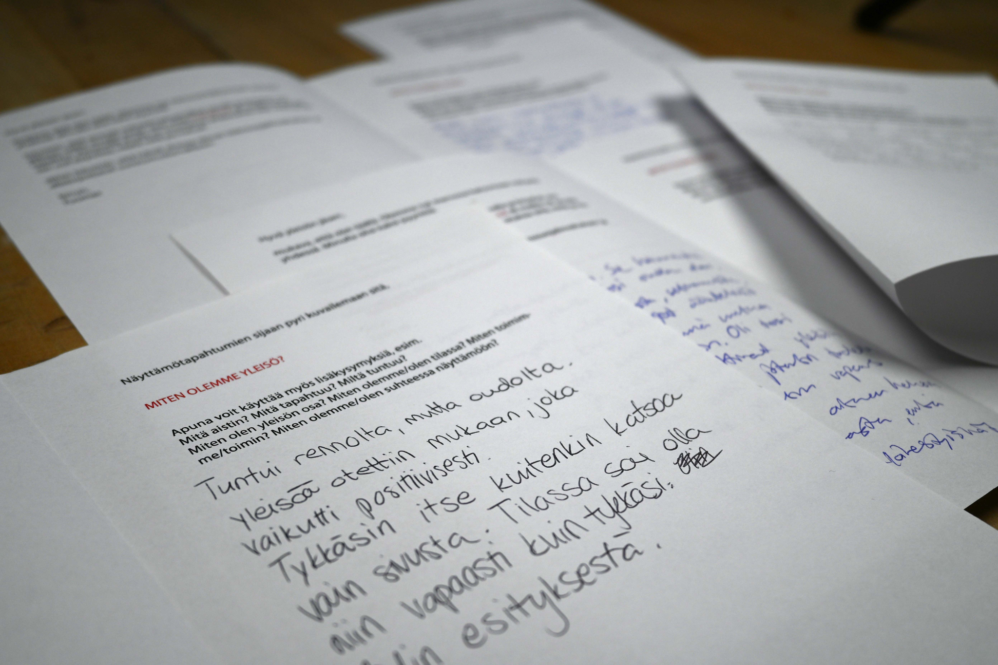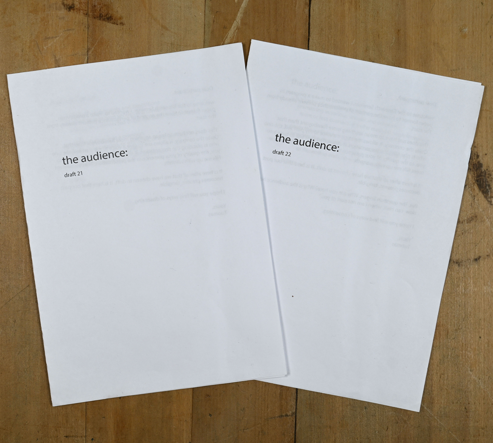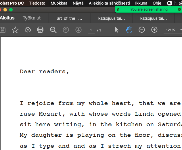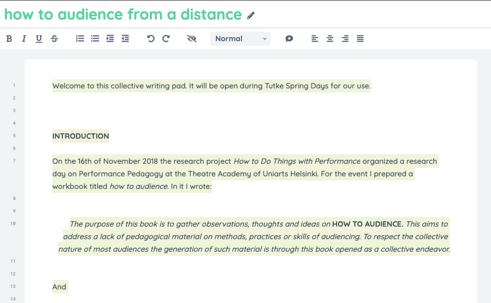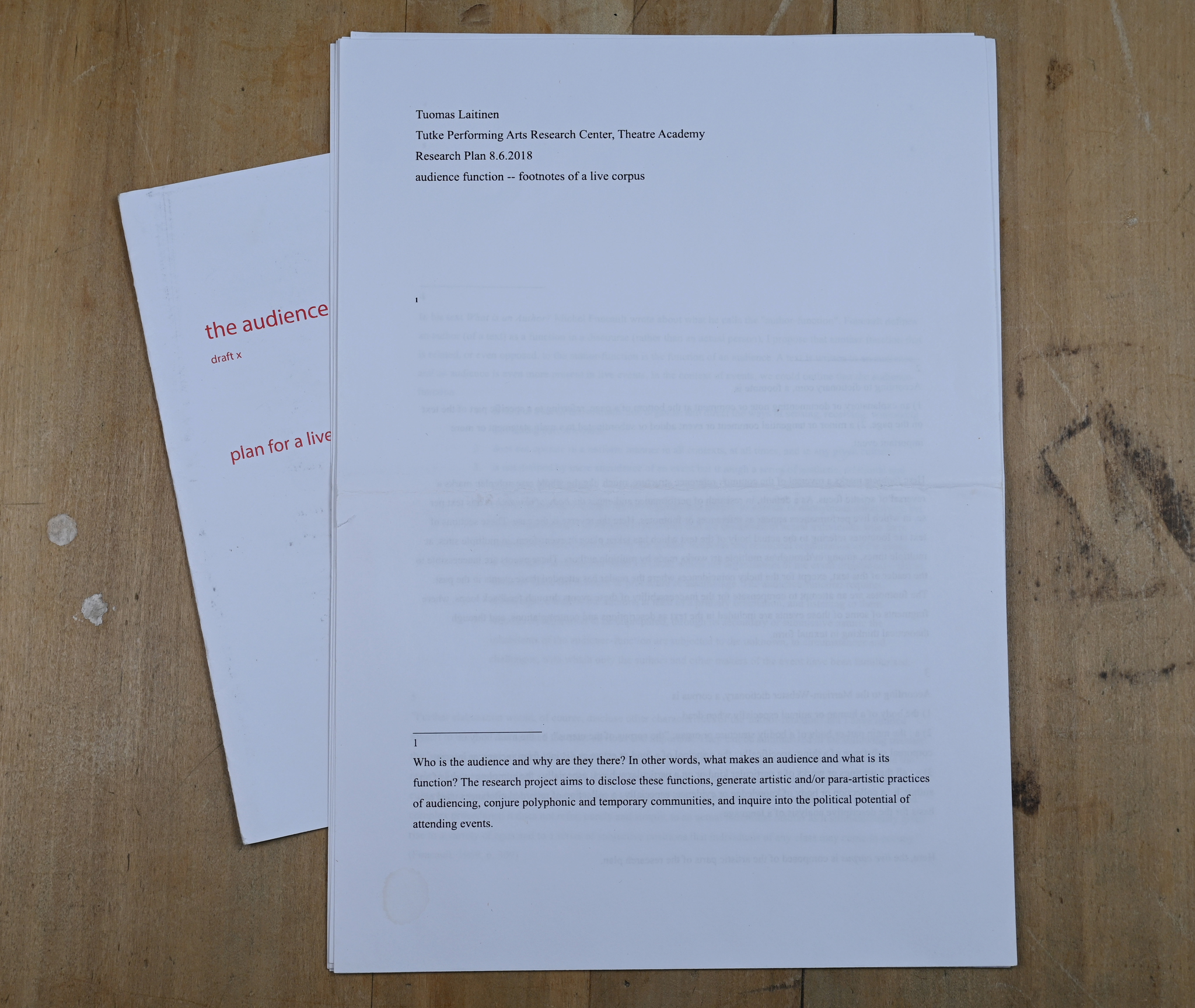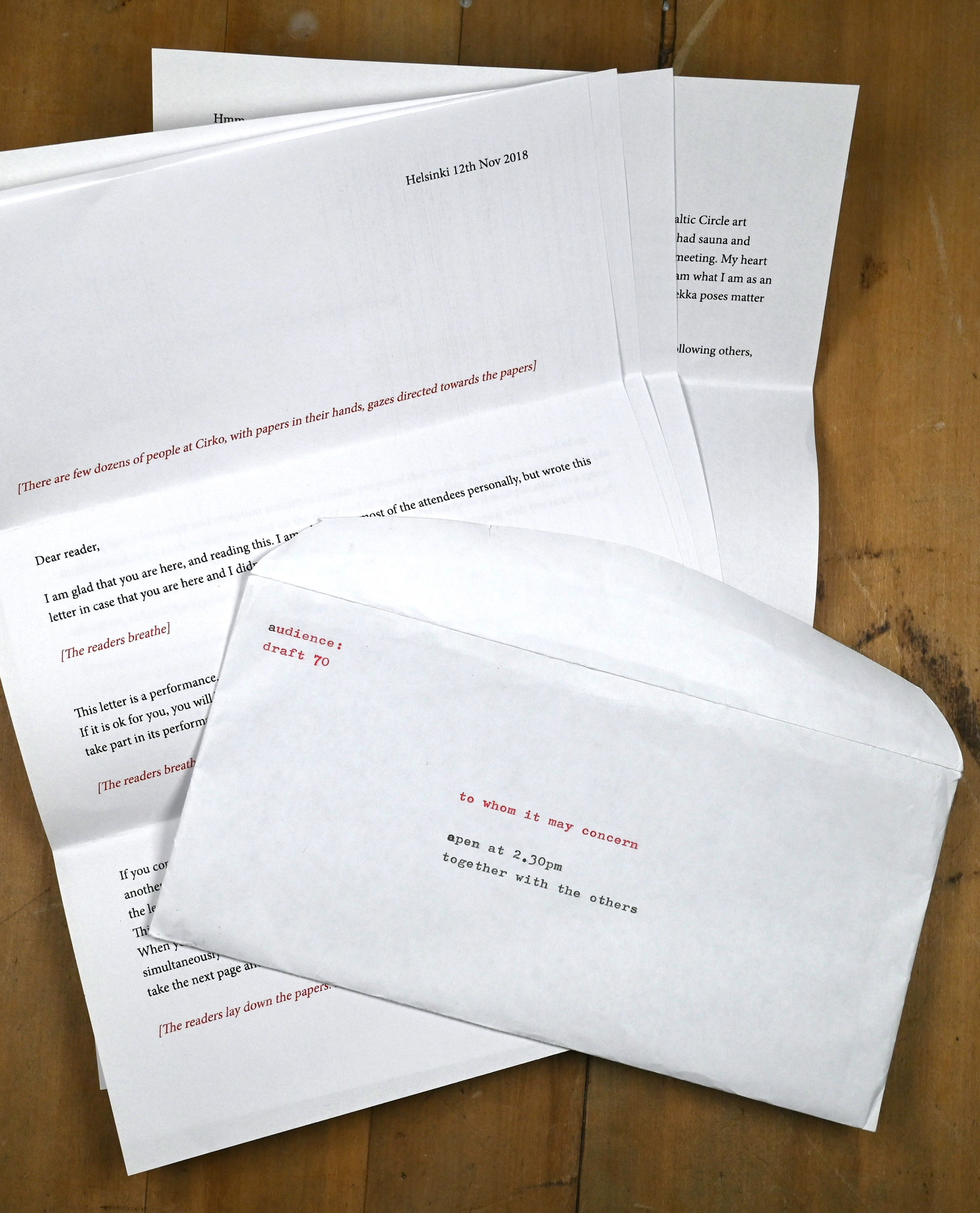 This artistic doctoral research approaches art, not as a variety of artworks or performances, but as a variety of collective bodies that are summoned. It addresses the subordinate and complicit way collective audience bodies form in relation to artistic performances. The commentary introduces the concept of an “audience body”, emerging when individual bodies gather to become an audience. Audience bodies are described through preconditions that are needed for one to appear, conditions that contribute to its subsistence and variables that determine the primary qualities and the degree of actuality of that audience body. More specifically, the commentary addresses the local genre of “esitystaide”, developed especially in the Helsinki-area during the last 30 years. Neologism “beforemance art” is introduced due to a lack of an English equivalent. Esitystaide/beforemance art is the artistic context of this study and is presented as a genre of art, in which the complicity of audience bodies is a fundamental material of artistic creation. The Finnish word “esitys”, being the medium of the genre of esitystaide, is defined as the sum of a performance and an audience body. The theoretical approach towards audience bodies is presented as impartial with regard to different genres of art, but the practice of research favours esitystaide/beforemance art. This leads to political conclusions that defend the exposed complicity of and the experimental relation to audience bodies which are characteristic for this specific genre. This theoretical argumentation has been developed through an iterative series of 30 drafts and two examined artistic parts, made by the author, as well as through a parapractice of audience membership. The drafts and examined parts are works of esitystaide/beforemance art, in which printed or digital texts are staged in different ways for audiences to read. The works and the thinking developed in them have been significantly affected by dialogues with audience members and their feedback. The commentary discloses how the process of thinking, resulting in the main arguments of the work, has evolved through this artistic research practice and how temporal, spatial, textual and material design of the events has been developed to address more adequately the phenomenon of an audience body. The parapractice of audience membership is introduced as a term describing the attendance of artworks made by others—a way of accumulating knowledge parallel to and yet different from practicing art. The arguments made in the commentary aim to provide conceptual tools for artists, scholars and pedagogues who attend the phenomenon of audience in their work. They can also serve as a basis for further research on the political significance of esitystaide/beforemance art and related art forms. Methodologically, the research offers an example of an iterative and dialogical artistic research practice and its presentation; the relationship between art and theory unfolds as both fruitful and troubled. Through the introduction of the parapractice of audience membership, it argues for using art, equally to the use of bibliographical materials, as reference material of artistic research. Through the use of a Finnish term and its local context as part of concept-creation in English, the work defends the importance of local thinking, which links artistic research to the land upon which it takes form.