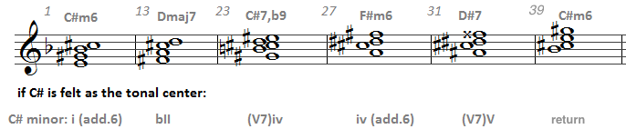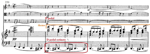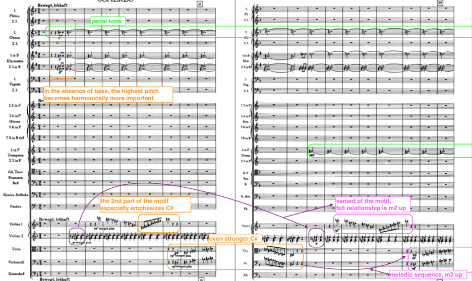 In the absence of any bass tone, the C# on the top of the chord becomes more prominent. The end of the first melodic motif (orange) is a pure C#m arpeggio. The sense of ‘completeness’ of the bass-motif (orange) projects the importance on its last pitch, C#. This could be felt as a confirmation of C# and its establishment as a (temporary) foundation. In this case, the Bb turns into the M6 of the chord. When the melodic motifs reappear in a sequence, a 2nd up, and the harmony changes into D-major, this could be felt as a logical proceeding to the bII subdominant under the tonic pedal (bII, then in D-minor, was in the first movement an important chord). In the following chord progression, we can recognize the pattern that is very common for the opening T-pedal (which will be discussed in the related chapter): (V)iv-iv, even though this pedal is not in the bass.