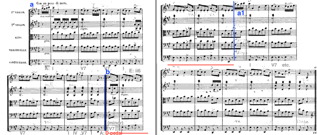 In case of small forms, recognizing a sectional D-pedal is helping the listener orientating in the form. It is also leading the listener through the musical story of the piece, by inciting excitement and preparing for important events. As a model, sectional D-pedal can work also outside of such small forms. It can suggest a particular interpretation of the musical events. The following example, the first movement of Mozart’s string quartet in D minor, KV421, is illustrating the working of the model sectional D-pedal as an actor in a sonata-allegro structure.
