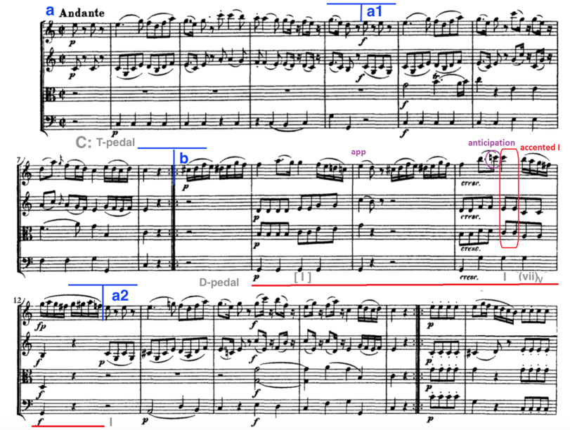 The first example is the theme of Mozart’s Romanze from kv.525 The pedal underlines two similar short (semi-)phrases. In the first, there is little harmonic activity. The tonic chord in m.9 is only slightly coloring the pedal (hence the brackets: [I]). In the second part of b, the melodic anticipation (Vln1) emphasizes the tonic chord in m.11. This emphasis overshadows the following chord (vii)V, and degrades it into a kind of passing chord (on the way to V). On another level, F#dim announces the completion of the pedal-event, as it most directly leads to the resolution of the harmony ‘into the pedal’. Even if not saliently perceived as a secondary dominant (due to the strength of the previous tonic, unaccented metrical position, and the emphasizes on the melodic component), this chord is implicative, and the listener will have strong expectations concerning the further events.