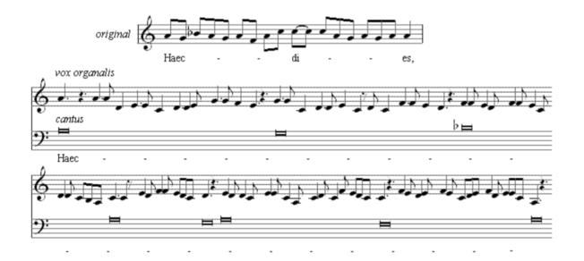 In Western art music, non-harmonic foundational drones could be found in early music. Improvising a melody above the very augmented notes of a cantus firmus could be felt as exploration of the sonorous realm created by the harmonics of the drones. Drones would in this case be the individual tones of the cantus firmus. Especially when the second voice is improvised, the singer focusses on the resulting sound between his voice and the sustained sound in the other voice. Each new long note opens the new space for exploration. Each new sustained tone is a local foundational drone.[3] An example of composed version is Leoninus’ florid organum Haec dies quam fecit Dominus.