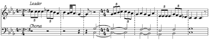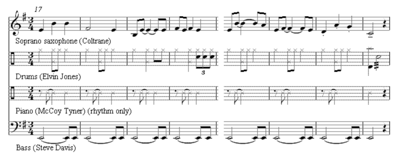 Foundational drones create space for other voices. In music based on slow harmonic rhythm (or no harmonic progression) the melodic voices are free to flourish. In modal jazz, for example, the melodic material is accompanied with static chords and pedal tones.[6] One of the great examples is John Coltrane’s song Olé (1961), featuring two bass players to hypnotic effect, with b pedal sounding throughout (18 minutes). His better known My Favorite Things is built on the foundation of chordal ostinatos on piano that sound over and over again, above the pedal e in the bass (transcription by Ingrid Monson (1996: 112)):
