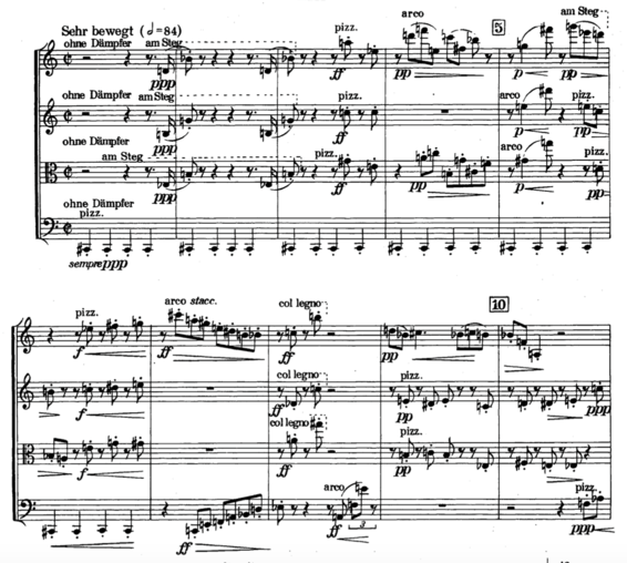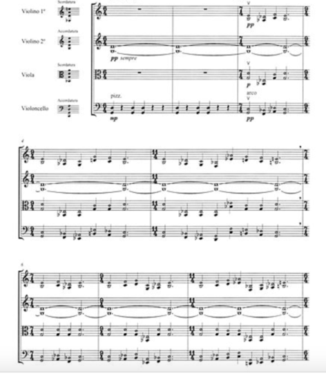 The double drone in Arvo Pärt’s Fratres for string quartet is realized as sustained fifth in the violin part, and occasionally doubled octave lower, by Vcl. The opening section of Fratres is placed in the middle-high and high register. The thin texture consists of the drones and the three melodic lines realized by flageolets above the drone (two voices in parallel thirds, and the third moving between the notes of the ‘tonic’ chord)