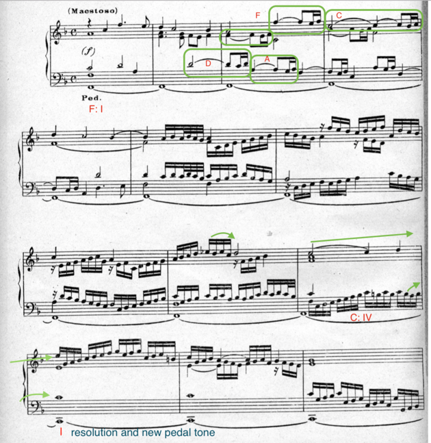 The tonic-ness of the pedal is, nevertheless, to a certain extent reinforced by the simple fact that it is a pedal. Although most of the chords are F major chords, the D-minor chord in m.3 would, without the pedal, have potential of being felt as a local tonic. The pedal contributes to anchoring the harmonies to F. It also colors them in this way. The appearance of Eb in m.9 creates the secondary dominant without disturbing the tonic-ness of F. The only moment when F changes its harmonic identity is in m.10, where several actors transform the pedal from foundational sound into dynamic harmonic function. The melodic line in the top voice, in combination with the melodic line (especially the last beat) of the lower voice, incite the expectation of the C-E third, and the C major chord. The harmony in m.10 so becomes the subdominant with sixte ajoutee, and the bass tone F is for the first time expected to resolve. A cooperative interaction between the melodic voices toward the C-major chord results in perception of the conflict between the bass tone and the anticipated resolution - the conflict that incites the expectation of the change in the pedal. Interestingly, at this moment the bass tone feels as a long harmonic bass, rather than the pedal tone that have been sounding already for ten bars. The cadential resolution in m.11 will bring new tonic, supported by the new pedal tone - the new cycle may begin.
