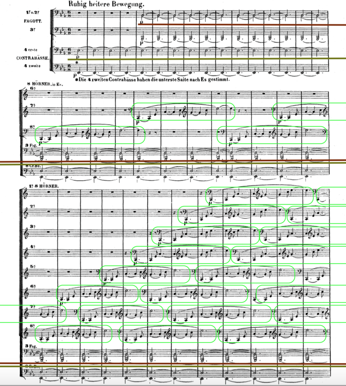 The composition that is often referred to as ‘the drone piece of classical music’ is the prelude for Wagner’s Das Rheingold. The perfect fifth, Eb-Bb, is held in low register for 113 bars (approximately 4:30 minutes). The Nature-motif is imitated in many voices above it. The motif itself consists of the notes of the Eb-major triad, which means that the whole prelude is based on one single chord - naturally felt as the tonic. All the musical events are thus harmonically united, there is no conflict. In this situation, the pitch is not the element that ‘tells the story’. The most dynamic parameter is the texture. The piece opens with the low drone Eb solo; the fifth comes a bit later. The Nature-motif presents the 1st, 2nd, 3rd, 4th, 5th, 7th, and 9th harmonics of Eb (counted from the fundamental). The voices that bring it are organized in gradually higher registers. But the drone is deep on the bottom, and it competes the optimism of the other events, adding a shiver. The drone stands out as a low textural layer. It opposes the other events (the whole network of Nature-motif imitations) by its immobility, its firmness. The imitations of the motif are at first clearly separated, and later in gradually closer stretti. The motif itself develops, including a couple of other pitches (as ornaments of the triad). The dynamics is increasing. The density of the texture is growing, and this incites tension. The drone still growls in the deep.