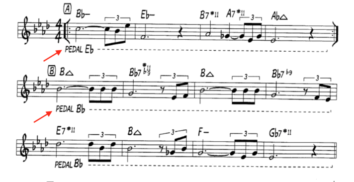 The song features two pedal tones in the bass (indicated in the score): Eb in the a section and Bb in the b section (of aba form). Although the key signature suggests these two are the dominants of the Ab major and Eb major key, this is not entirely the perceived harmonic meaning. When listening to this song for the first time, the power of the bass-tone roots the Eb, and absorbs the chord-notes in itself. The second chord (Ebm7) ‘justifies’ the existence of the Eb in the bass, and confirms it as a temporary foundation. At least temporary, Eb feels as the tonic. Further chord changes take the listener in another direction. In b section, Bb starts as the dominant pitch but slowly, its harmonic power is weakening (especially during piano solo).