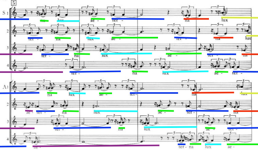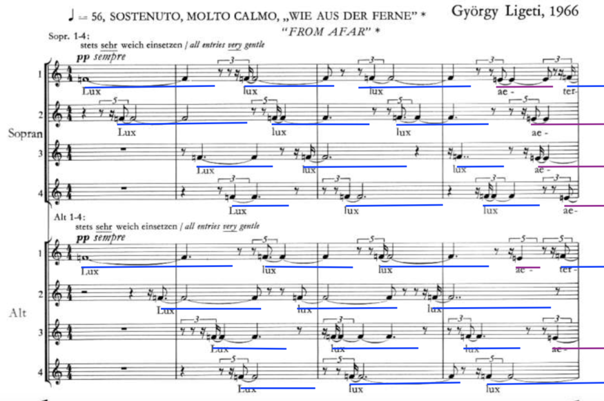 Lux Aeterna opens on one pitch, F, and due to its long duration and repetitions, eight voices will sing it in unison before the second note of the canon (E) sounds. The image below shows the first bars. The soprano 1 part exposes the first five notes of the theme (F-F-F-E-F-). The blue lines show the moments any new F tone sounds: except from the very beginning, none of them starts simultaneously. Soft entrances just slightly change the timbre of the united F tone. Purple lines show the moments any new E sounds. These tones also merge into one E, with variable texture (timbre). Each pitch is felt as one tone, but this one tone is very dynamic, softly trembling as the new singers join it, thinning out as they, one by one, leave it.