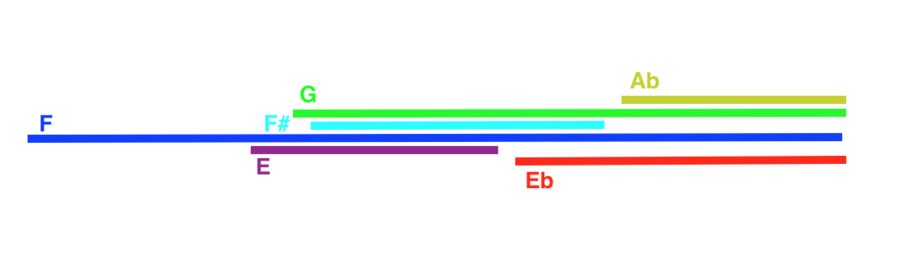 The following image shows the duration of each tone; blue lines represent pitch F, purple lines represent pitch E. The emergence of new pitch E happens under the still sounding pitch F. Now they sound together, as two layers, next to each other. The return of F at the end of m.4 is not perceived as a new tone in the horizontal sequence but rather as thickening of the F that still sounds in other voices. Each new pitch (that does not already sound) becomes a new layer, for as long as it sounds.