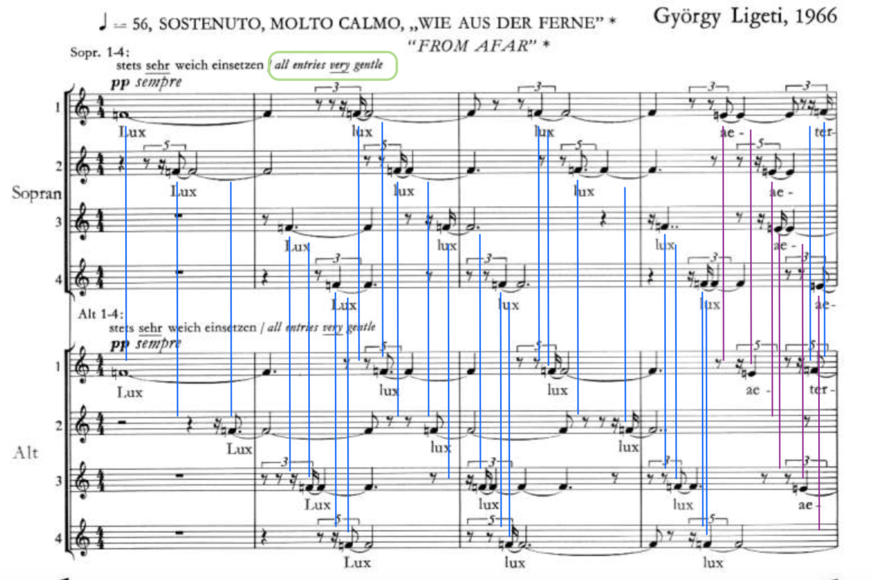 Lux Aeterna is a choral piece for 16 voices. The whole sections are composed as canons. The canons are, however, not perceptible. Ligeti has coined the term ‘micropolyphony’, and it refers to the compositional process in which "polyphony is written, but harmony is heard. […] The polyphonic structure does not come through, you cannot hear it; it remains hidden in a microscopic, underwater world, to us inaudible. I call it micropolyphony (such a beautiful word)”. (Ligeti).[1] Word ‘harmony’ should be understood here as sonority, rather than chords. Because, very often we hear chromatic and diatonic clusters, and other pitch-assemblages of very diverse interval-structure. The ‘sound-mass’ is constantly being transformed, and this is perceived as one of the ‘stories’ of Lux Aeterna. The texture is one of the most important parameters here.