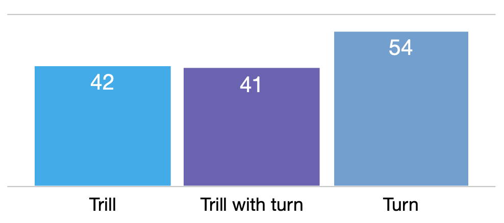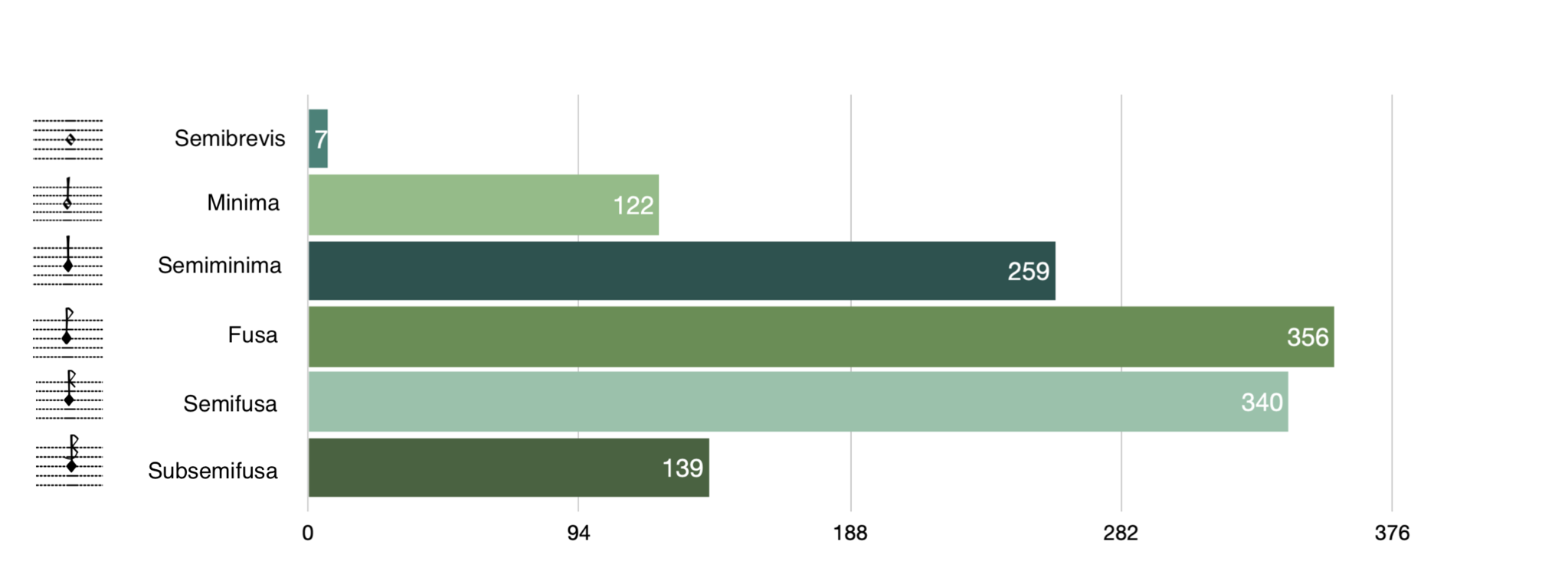 The table below shows how often the mentioned note values appear. This applies only to note values within the ornament; the final note is not included, as it will be addressed in a later section.