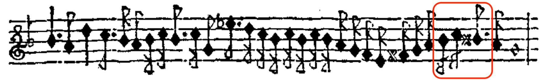 An interesting example of musica ficta can be seen on the right. Bovicelli adds a sharp, which creates a problem. The issue is related to rule number 2: this high E is what we call a fa super la. This should always be a half-step interval, meaning that it should be an E-flat. However, notating an E-flat would lead to another problem, namely the dissonant interval between the E-flat and the A that comes after. In other words, Bovicelli sacrifices rule 2 in order to follow rule 3.