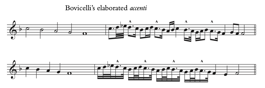 Because these accenti fall on the strong beat, they create dissonance and are often described as 'lazy', or even as 'neglect'.8 In this way, Bovicelli demonstrates another method of adding drama and emotion to his music, introducing an extra layer that hints at the expressivity of music and ornaments of the Baroque period.