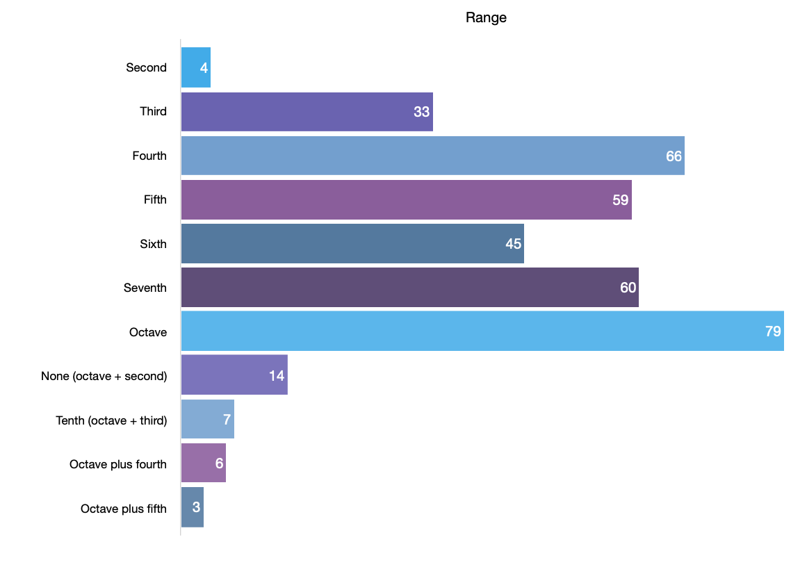 The range varies from very small to very large. The smallest interval of range is a second, and the largest is an octave plus a fifth. Most common ranges go from a fourth to an octave. The least common ranges are the smallest (the second) and the largest (the octave plus a fifth). Any range larger than an octave is very rare.