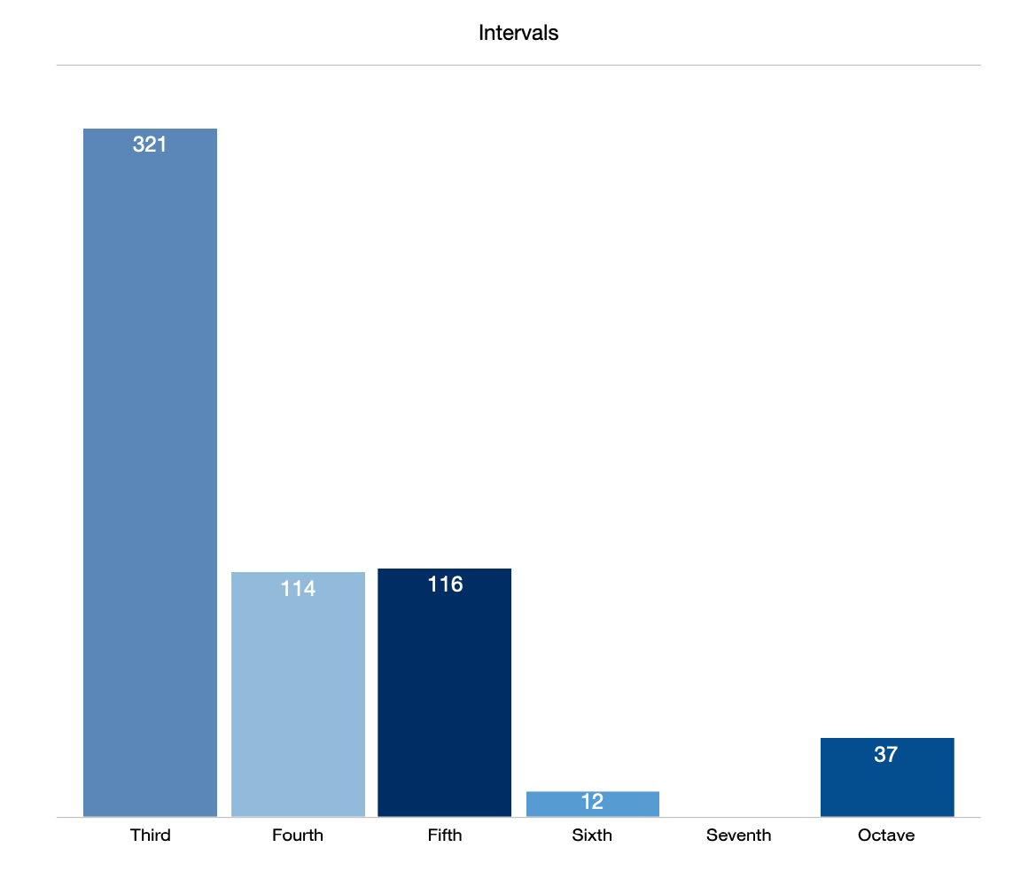 It is clear that the third is the most common. The fourth and fifth occur sometimes, the octave rarely, and the sixth very rarely. It is notable that the seventh never appears.