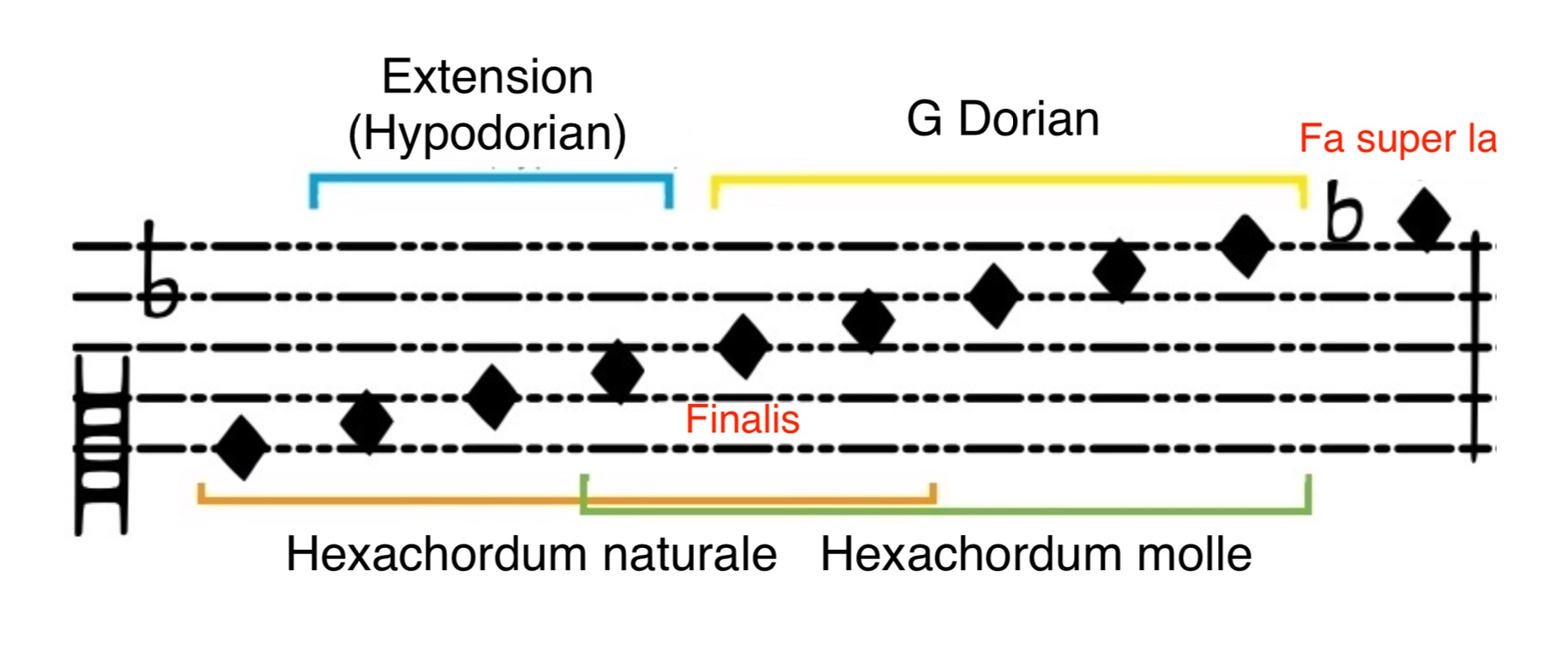 A 'normal' dorian mode covers the range of an octave, starting from D, which serves as the finalis (or, in modern terms, the tonic).4 The range of a hypodorian mode, however, differs as it extends to lower notes. In the hypodorian mode, the scale spans from the A below D—while D remains the finalis—up to an octave above the A. This range though, can be extended down do a G and up to a B-flat.5