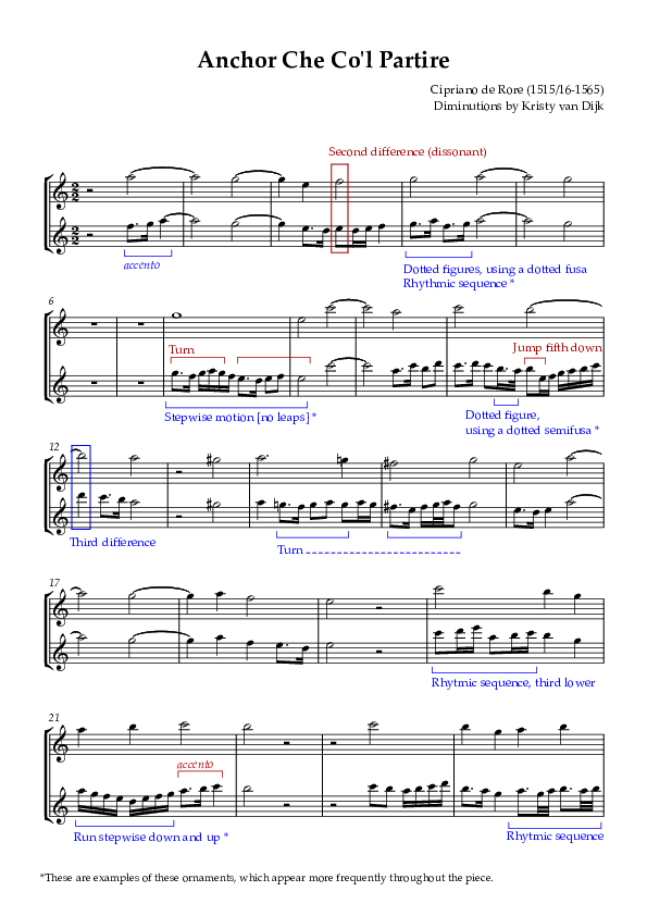 I have aimed to capture this varied and distinctive style in writing my own diminutions on the piece Anchor che col partire, incorporating the same stylistic ornaments that I have found in the previous chapter, findings and discussion. This piece is a well-known madrigal composed in 1547 by Cipriano de Rore, who was particularly admired by composers later in the century.1 Choosing this piece allows me to replicate Bovicelli's ornamentation style within that context.