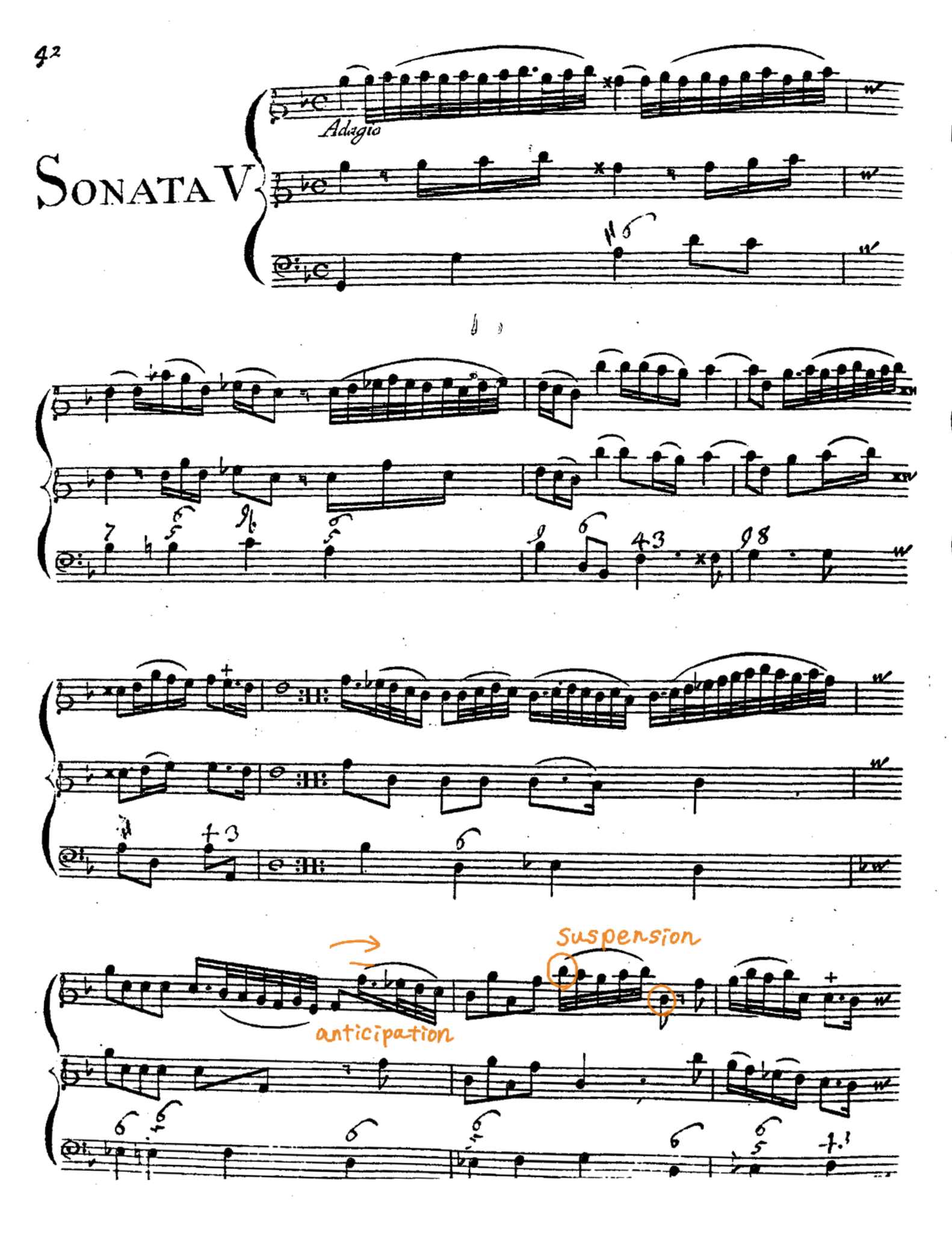 "There are in any case plenty of string antecedents for this manner. The one most often mentioned is the Amsterdam printing of Corelli’s Op.5 violin Sonatas (1710) which has ornaments in the slow movements attributed to Corelli. These are in quite a different style from later ornamentations for Corelli’s Sonatas by Geminiani and others in that they tend to have very light filigree ornaments at the end of the note, rather than a steady level of rhythmic ornamentation."2